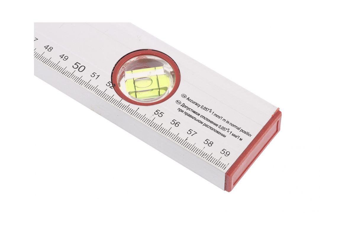 Корпус уровня изготовлен из прямоугольного анодированного алюминиевого профиля. Вес погонного метра – 0,17 кг. Имеет анодированное покрытие. Пластмассовые заглушки на обоих концах. Модель имеет три акриловых глазка для проверки отклонений по горизонтали, вертикали и под углом 45 градусов. Точность измерений – 1 мм м (0,057 градуса).