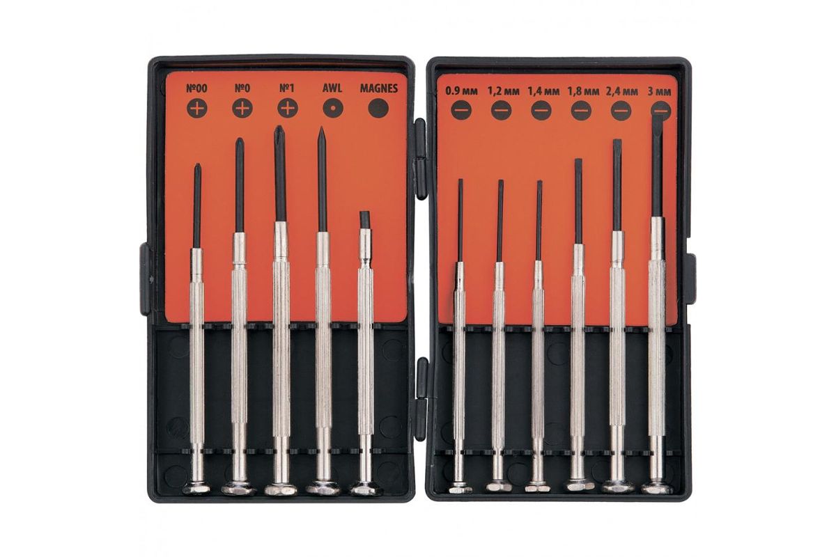 В наборе 11 отверток (№00; №0; №1; AWL; MAGNES; 0,9 мм; 1,2 мм; 1,4 мм; 1,8 мм; 2,4 мм; 3 мм).