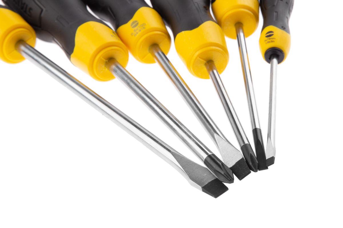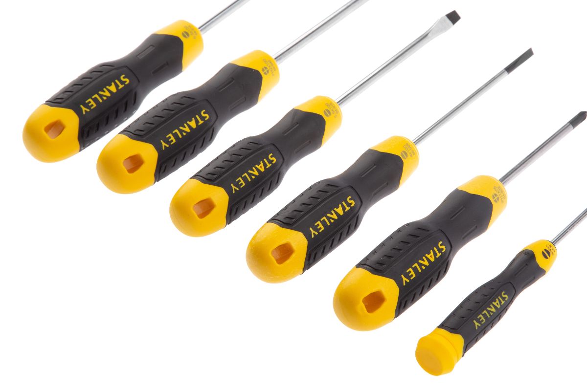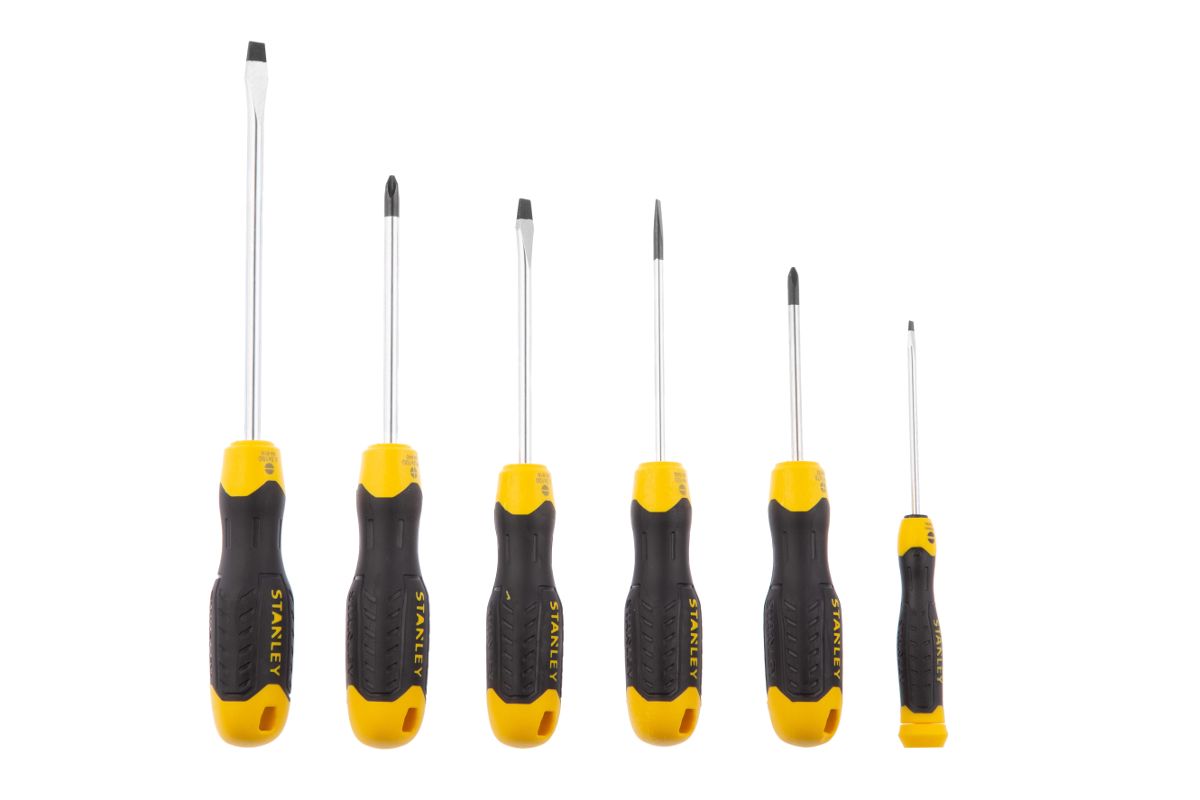 Набор из 6 отверток Stanley CUSHIONGRIP 0-65-007 подойдет для монтажа и демонтажа крепежа с прямым и крестовым шлицами. Намагниченные стержни инструментов изготовлены из хромованадиевой стали с хромовым антикоррозийным покрытием. Мягкие рукоятки для комфортного удержания и продолжительной работы. На рукоятках расположены маркировки шлица.