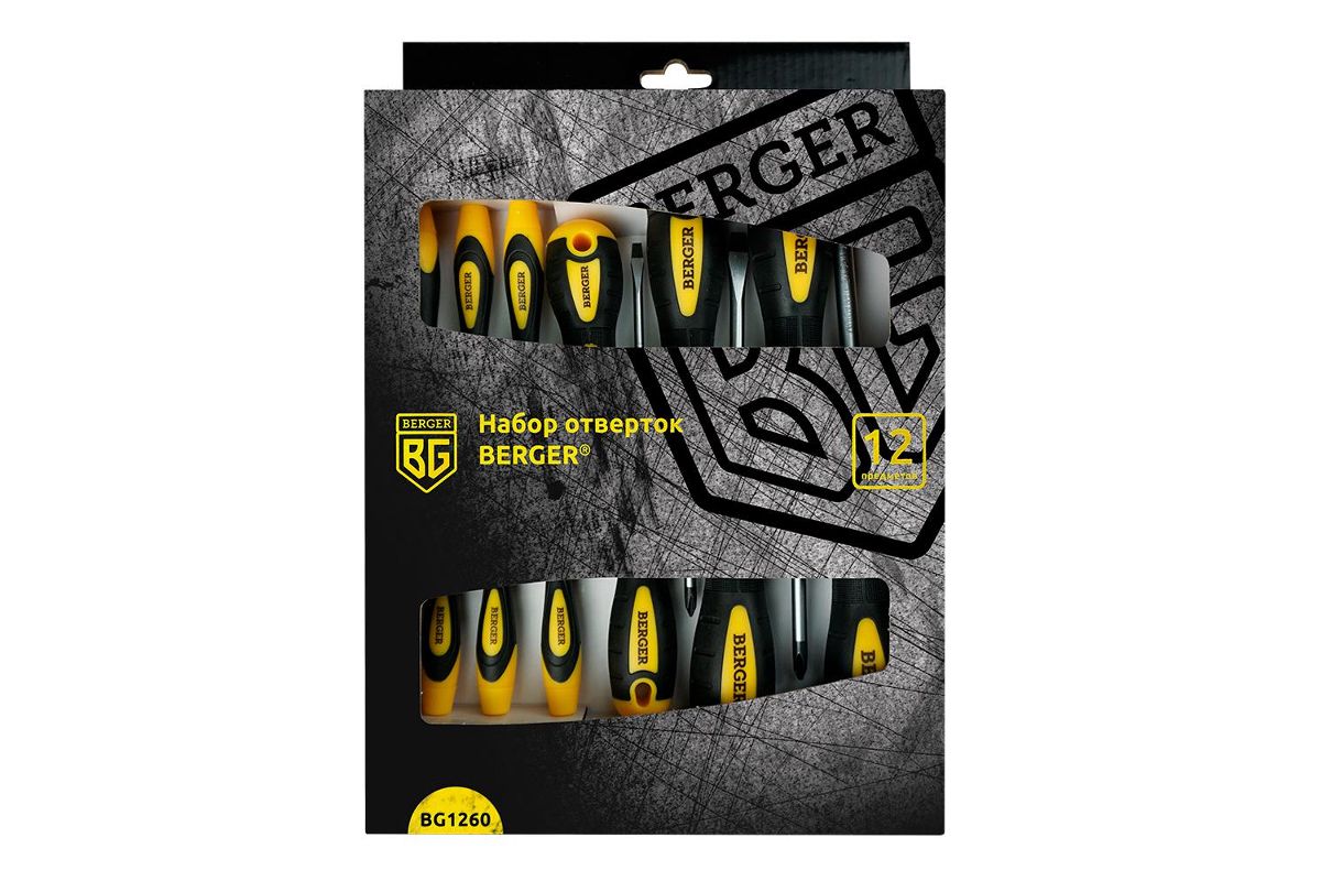 Набор отверток 12 предметов Berger BG BG1260 включает востребованные типы наконечников и размеры резьбы. Комплект выполнен из качественной стали: твердость материала 51-54 HRC, CR-V 6150.