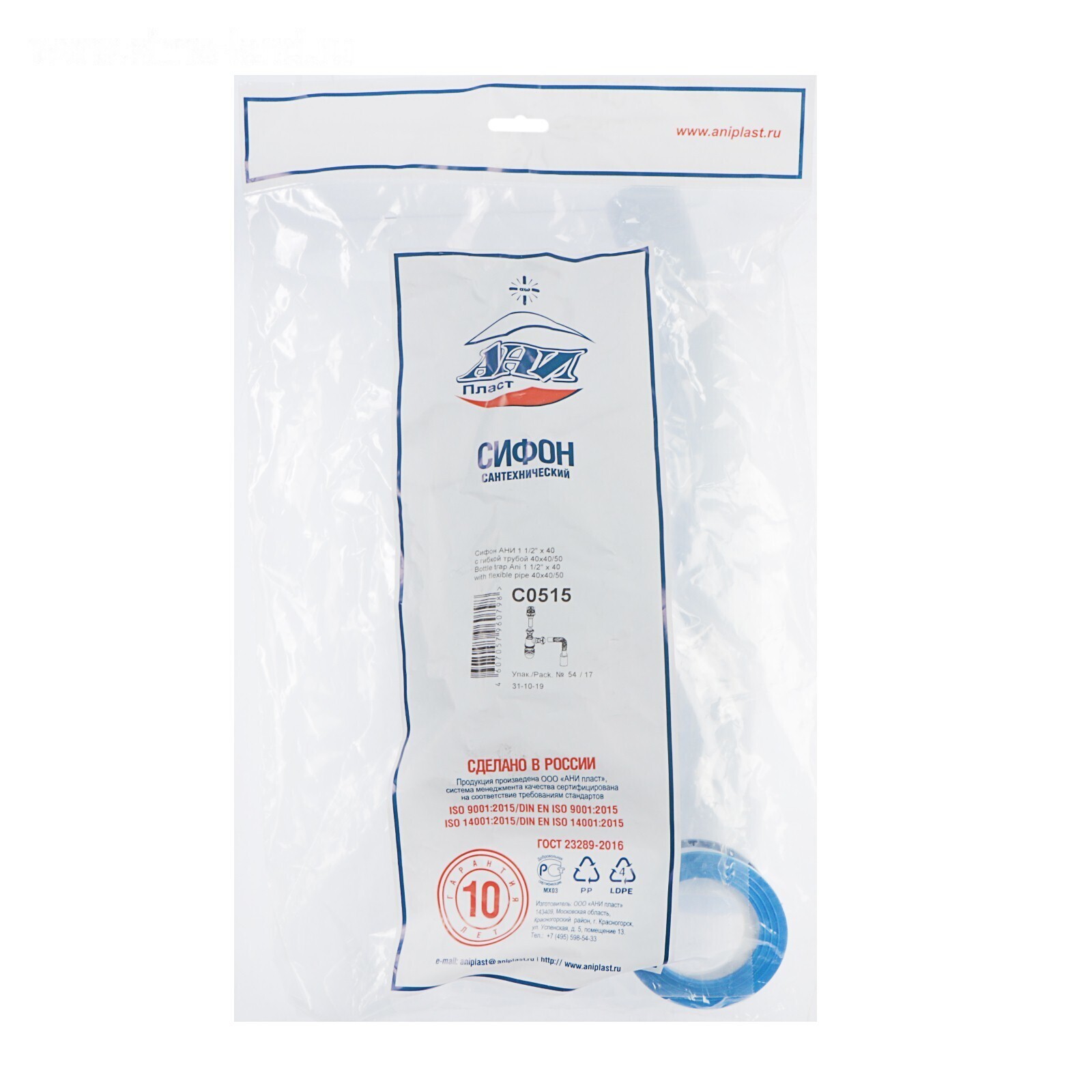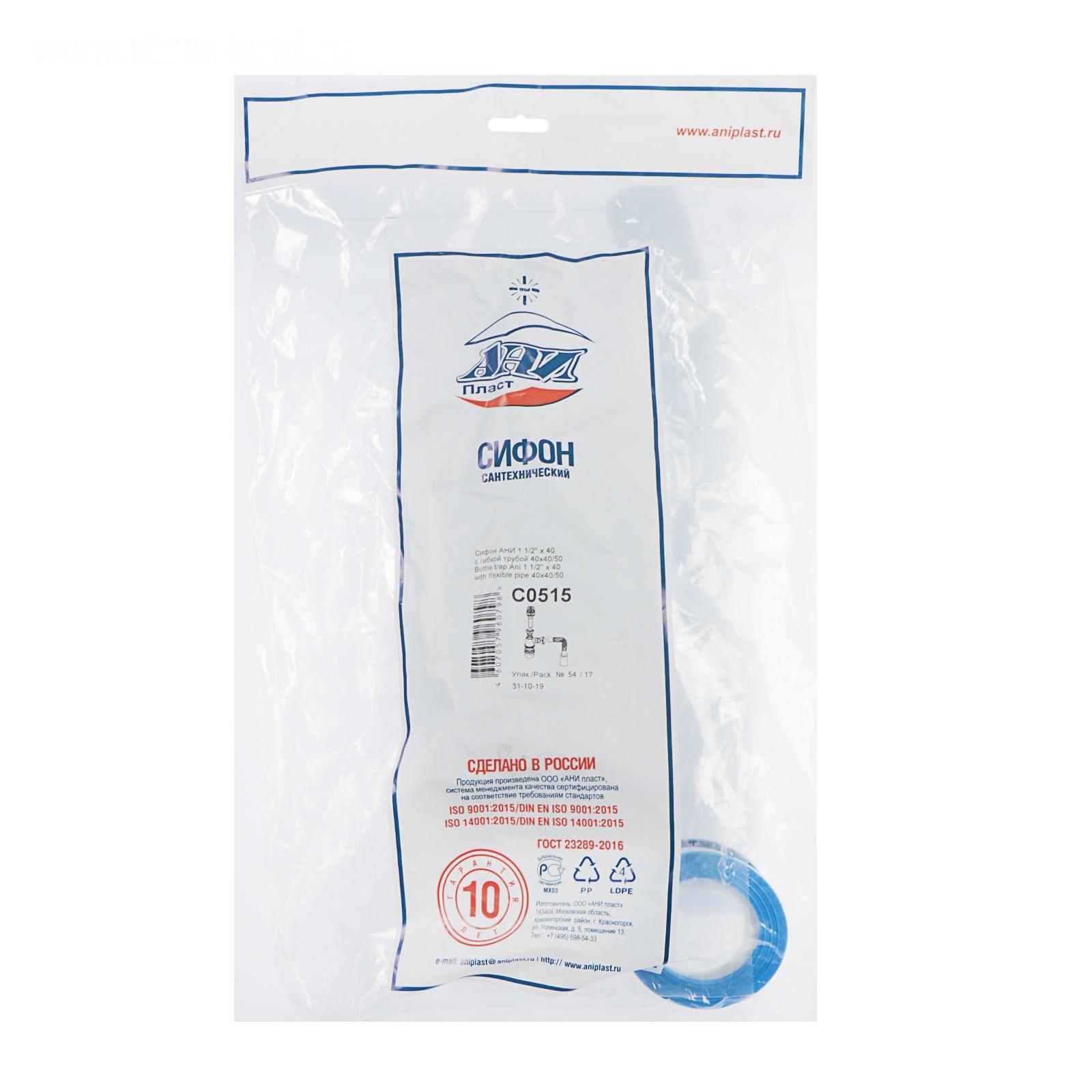 Сифон "АНИ Пласт" С0515, 1 1/2" х 40 мм, с гофрированной трубой 40 x 40/50 мм