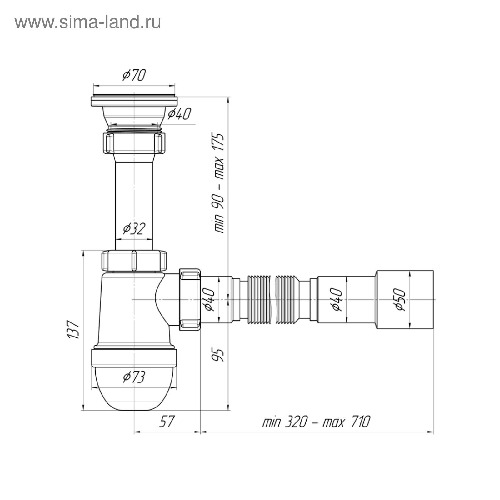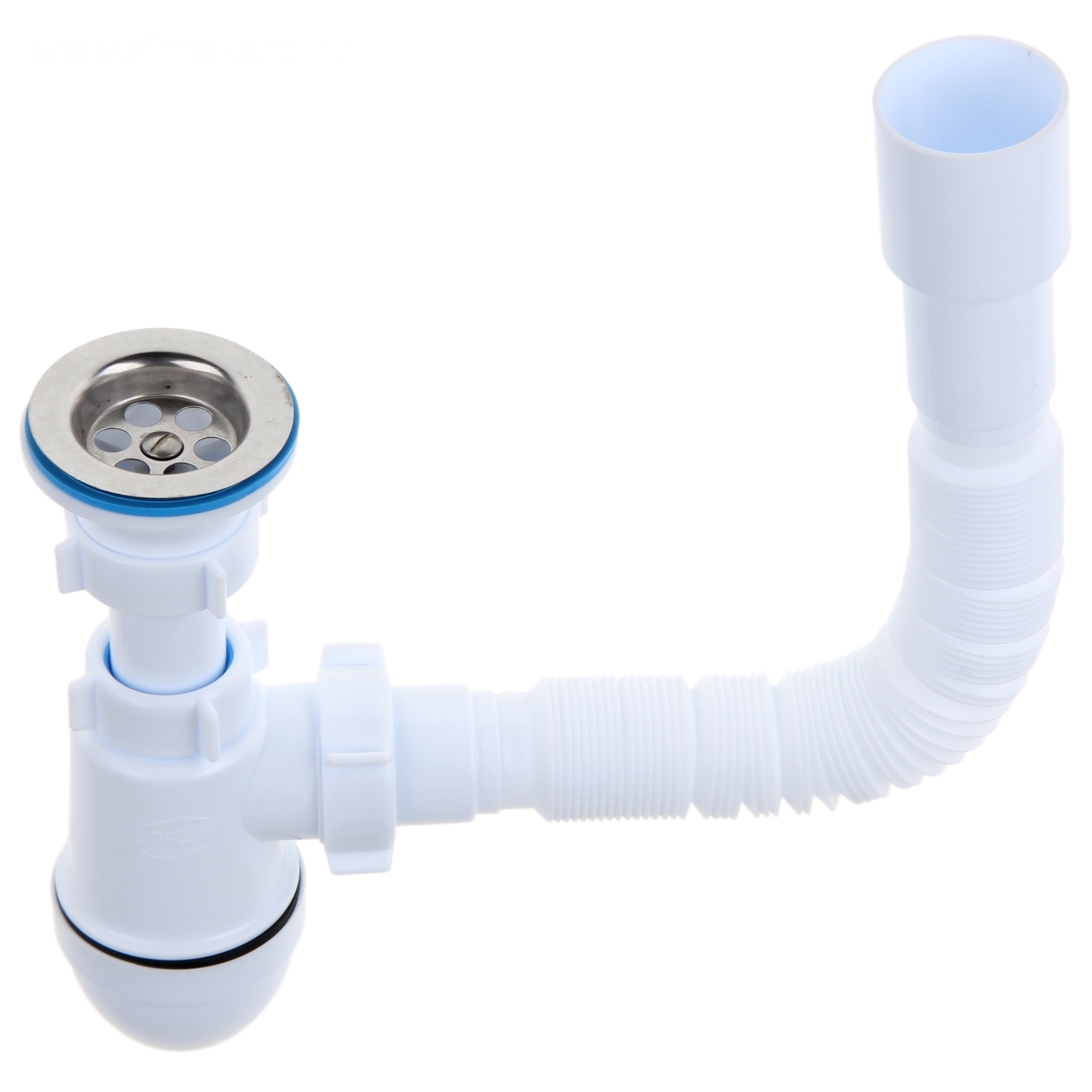 Сифон бутылочного типа предназначен для кухонной мойки с диаметром сливного отверстия 50 мм.