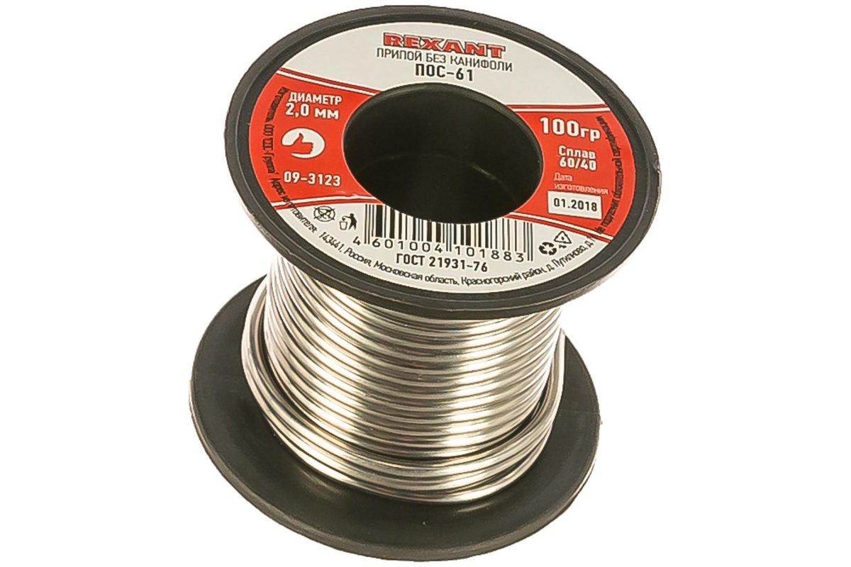 Припой без канифоли REXANT 09-3123 ПОС-61 100 г, D 2,0 мм, (олово 61%, свинец 39%), катушка