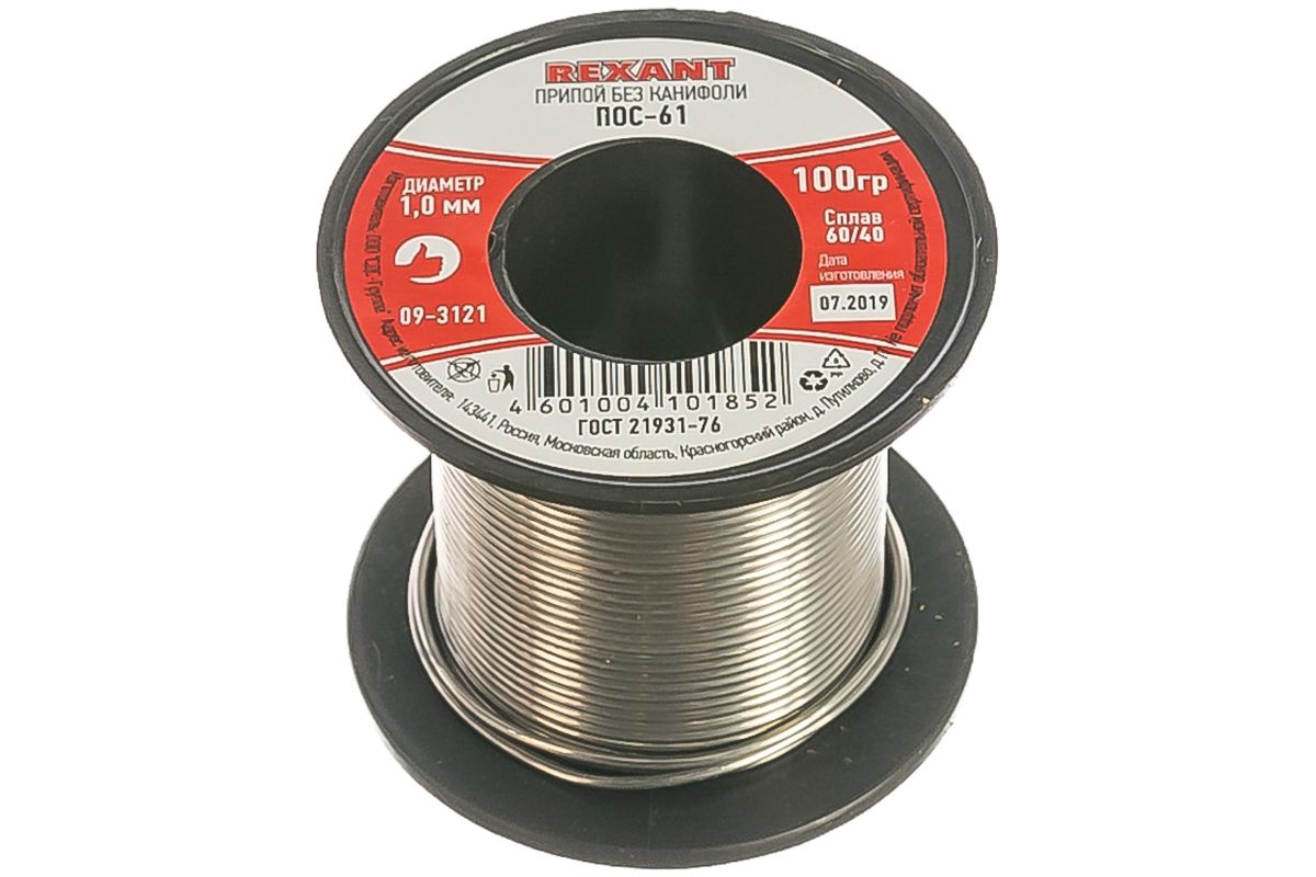 Припой без канифоли REXANT 09-3121 ПОС-61 100 г, D 1,0 мм, (олово 61%, свинец 39%), катушка