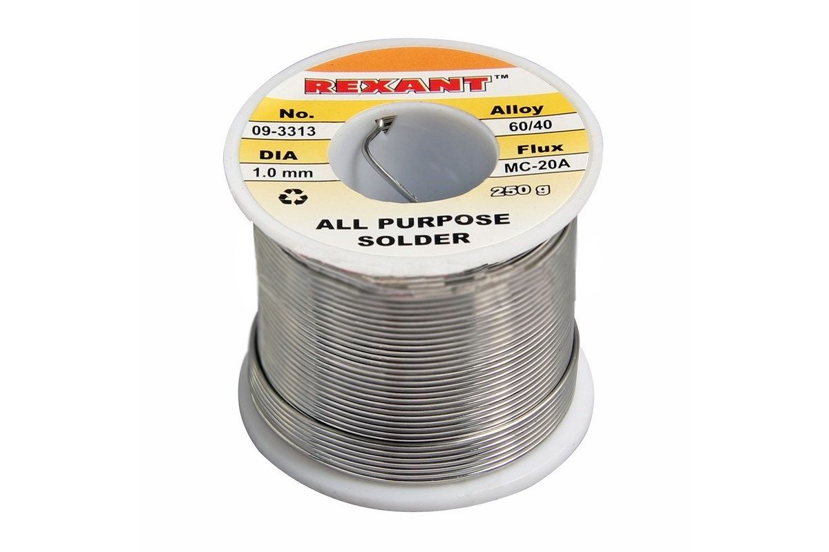 Припой с канифолью REXANT представляет собой проволоку (диаметром 1 мм) из сплава олова (60%) и свинца (40%).