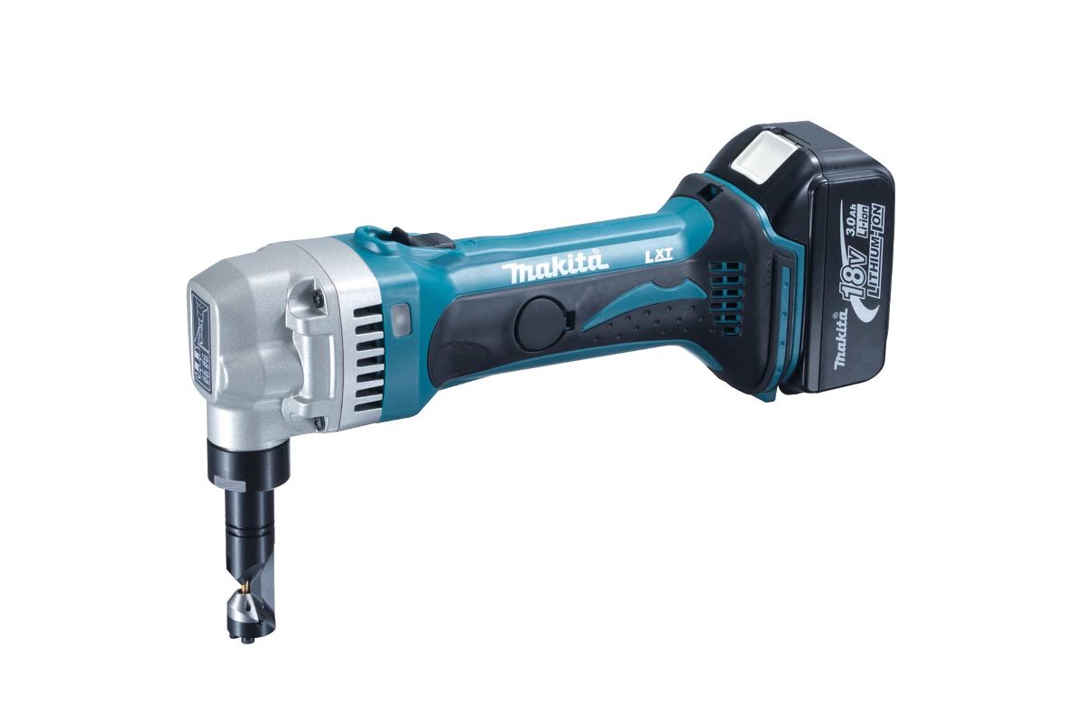 MAKITA DJN161RFE – высечные ножницы для резки металла. Справляются со стальными, алюминиевыми и другими металлическими листами толщиной от 1,2 до 2,5 мм. Могут резать по прямой или выполнять фигурную резку с максимальным радиусом внешней кромки 50 мм. За минуту совершают до 1900 ходов штока.