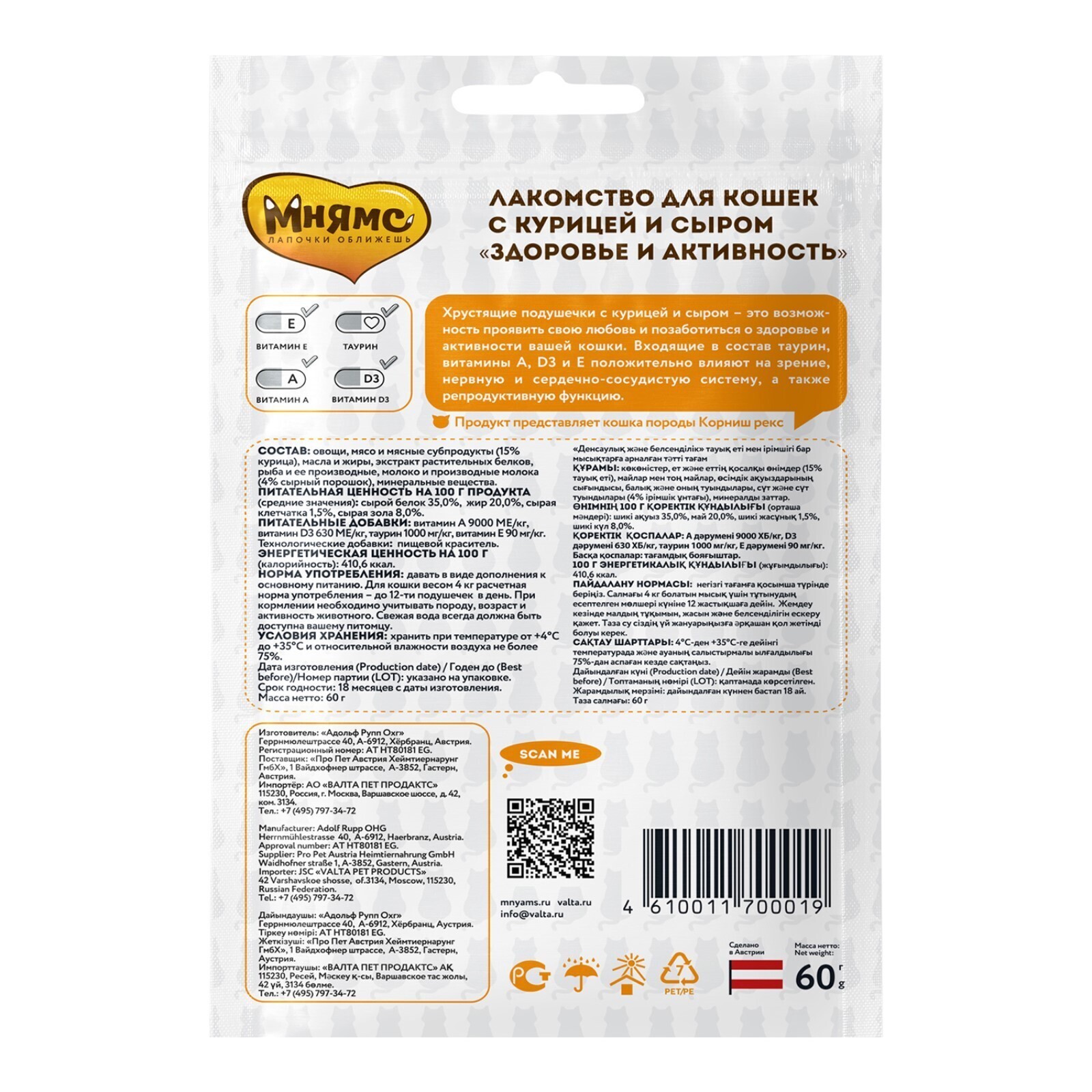 Хрустящие подушечки Мнямс "Здоровье и активность" для кошек, курица, сыр, 60 г