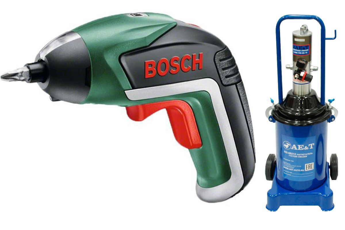 В состав набора входят: Нагнетатель AE&T HG-68212 густой смазки пневматический, Отвертка BOSCH IXO V bit set аккумуляторная.