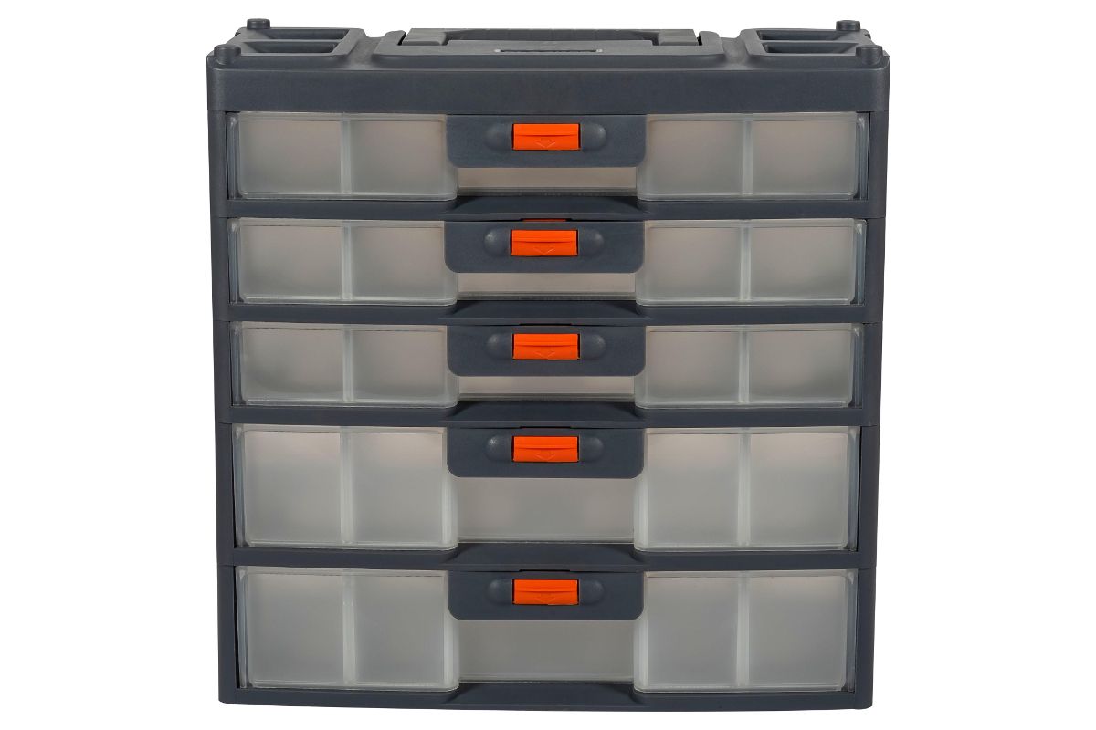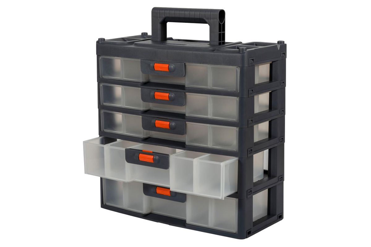 Универсальный сет для мелочей с ручкой для переноски. 5 секций со съемными перегородками внутри, фиксирующиеся замками, надежно защищающими от случайного открывания.