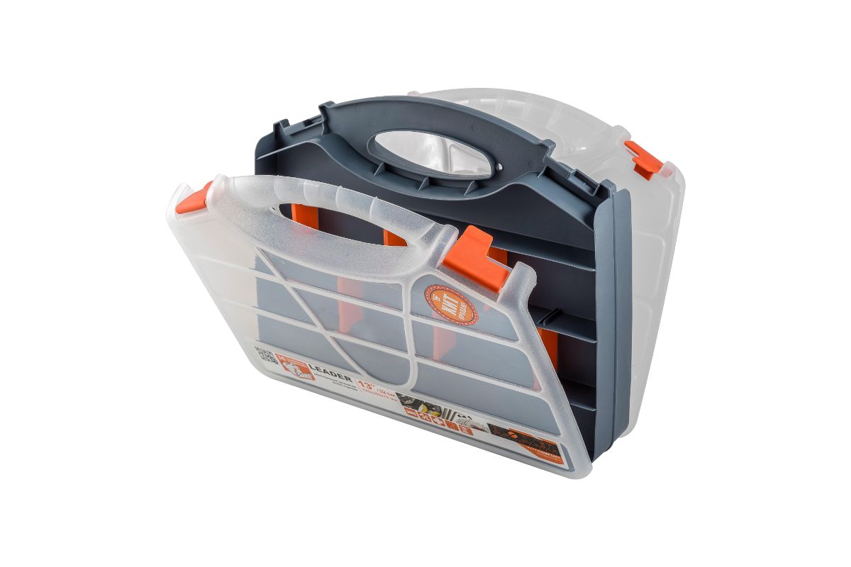 Двухсторонний органайзер Leader выполнен в форме кейса, служит для хранения и переноски крепежа и мелких деталей. Прозрачная крышка, небольшой размер и продуманная эргономика делают хранение любых мелочей простым и эффективным. Надежные замки-защелки предохраняют от непреднамеренного открытия. Набор съемных разделителей позволяет организовать пространство, количество и размер ячеек в соответствии с Вашими пожеланиями.