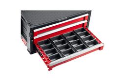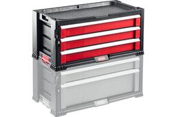 Легкая передвижная модульная система, элементы которой просто и надежно крепятся между собой. Состоит из колесной базы и 2-х модулей: ящиков, оснащенных выдвижными полками разных размеров, с дополнительными внутренними ячейками. Каждый ящик имеет собственную систему блокировки, а также ручки для переноски. Специальные встроенные защелки фиксируют модули между собой.