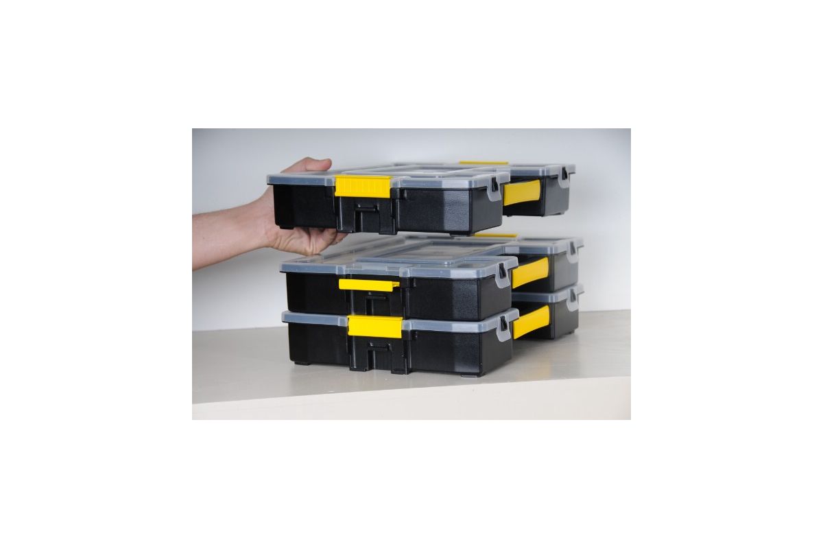 Органайзер Sort Master Junior Stanley 1-97-483 выполнен в форме кейса, служит для хранения и переноски крепежных изделий. Состоит из нескольких отделений, где удобно размещаются необходимые аксессуары и различные мелочи. Прозрачная крышка позволяет видеть расположение крепежа внутри. С помощью переставных перегородок можно регулировать размеры ячеек, чтобы максимально эффективно использовать пространство. Боковые защелки позволяют сцеплять несколько ящиков между собой. Удобная ручка помогает легко транспортировать органайзер.