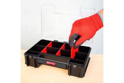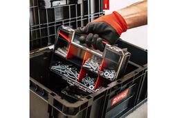 6 регулируемых перегородок (10 ячеек). Прозрачная крышка позволяет видеть распределение крепежа внутри, изготовлена из поликарбоната, что обеспечивает ее особую прочность и устойчивость к повреждениям. Для транспортировки есть удобная рукоятка. Две защелки надежно удерживают крышку и исключают открытие органайзера.