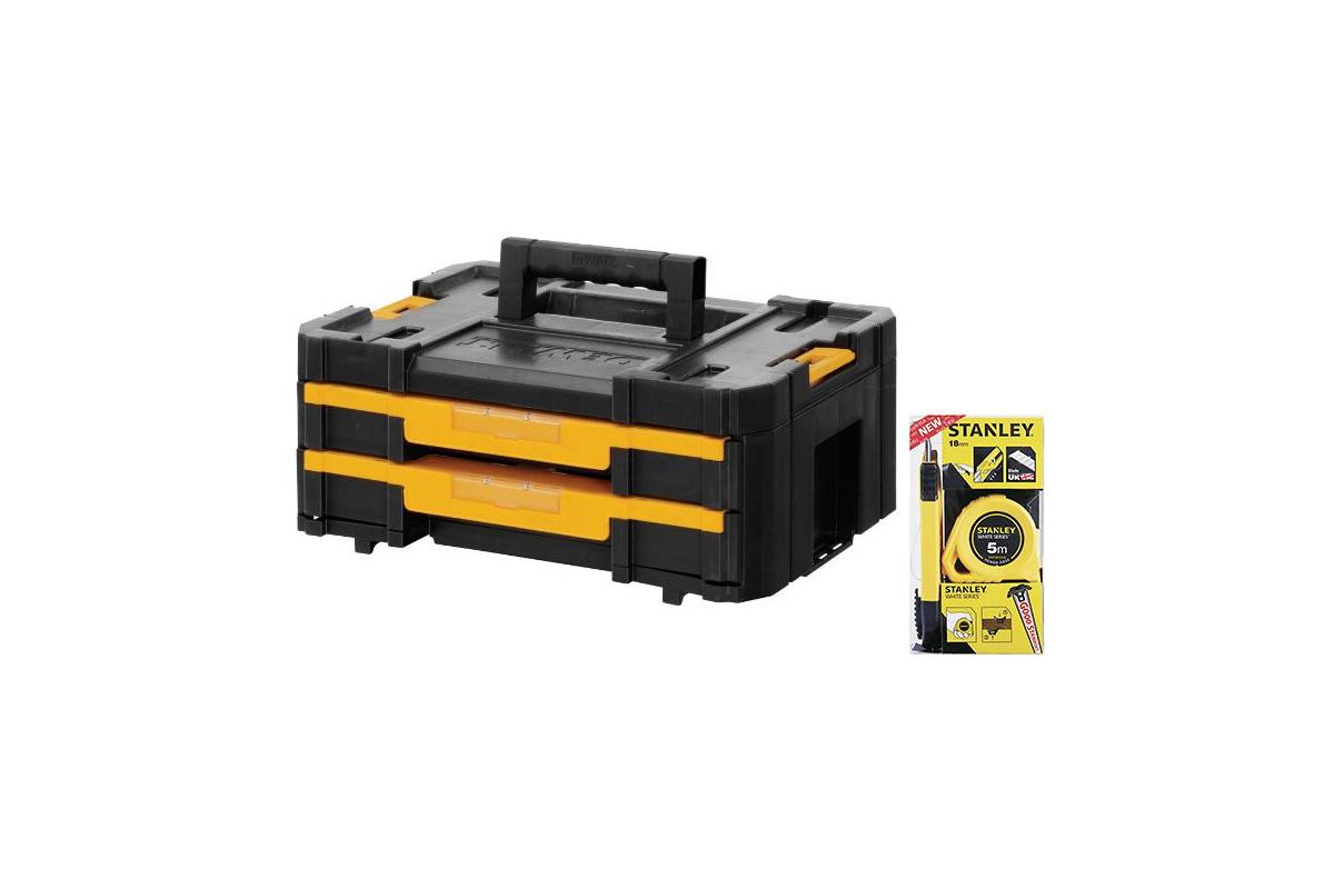 В состав набора входят: Ящик STANLEY DEWALT TSTAK DWST1-70706 с 2-мя выдвижными секциями, НАБОР STANLEY ИЗ РУЛЕТКИ 5М И НОЖА 18ММ