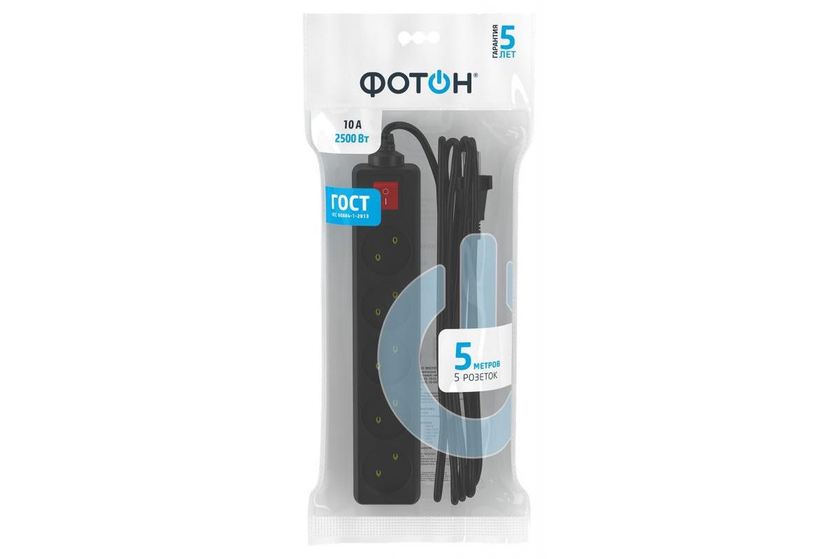 Удлинитель сетевой ФОТОН 10-55S (22728) 5м, 5 розеток, 10А, с выкл., Черный