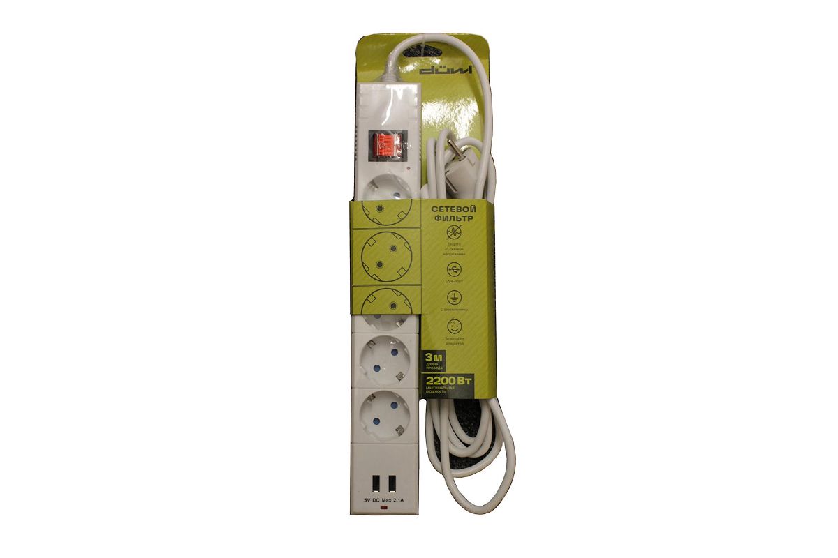 Сетевой фильтр белого цвета, имеет 5 розеток с заземлением. Также в корпусе присутствует 2 USB-порта, предназначенные для зарядки различных мобильных устройств. Большая и удобная кнопка на корпусе позволяет включать и выключать сетевой фильтр не вынимая вилку из розетки. Встроенная индикаторная лампа сигнализирует о состоянии прибора. Провод оснащен литой вилкой удобной г-образной формы с заземляющим контактом. Длина провода сетевого фильтра составляет 1,5 метра. В отличие от обычного удлинителя, сетевой фильтр сглаживает импульсные помехи и скачки напряжения, обеспечивая безопасную работу бытового и офисного электронного оборудования.
