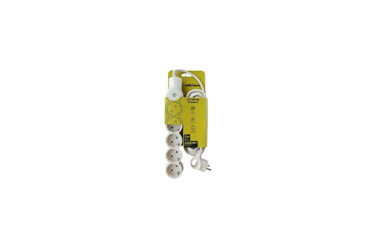 Сетевой фильтр белого цвета, имеет 5 розеток с заземлением. Встроенная индикаторная лампа сигнализирует о состоянии прибора. Провод оснащен литой вилкой удобной г-образной формы с заземляющим контактом. Длина провода сетевого фильтра составляет 1,5 метра. В отличие от обычного удлинителя, сетевой фильтр сглаживает импульсные помехи и скачки напряжения, обеспечивая безопасную работу бытового и офисного электронного оборудования.