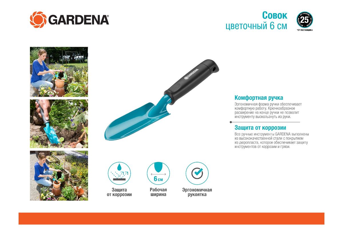 Для высадки и пересадки растений. Рабочая ширина 6 см. Из высококачественной стали с защитным покрытием от коррозии. Рукоятка эргономичной формы. Крючковый захват на конце рукоятки против скольжения при движении на себя. Гарантия 25 лет.