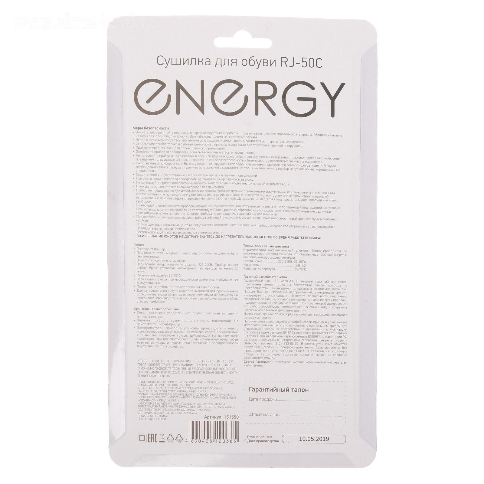 Сушилка для обуви ENERGY RJ-50C предназначена для сушки обуви в бытовых условиях. Имеет керамический нагревательный элемент. Тепло проводится по алюминиевым деталям сушилки, что обеспечивает быстрый нагрев и качественное просушивание обувь.
