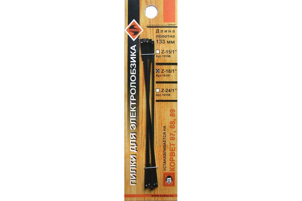 Пилки ЭНКОР 19197 предназначены для лобзиковых станков «Корвет 87» и «Корвет 88». В комплекте 5 пилок длиной 133 мм.