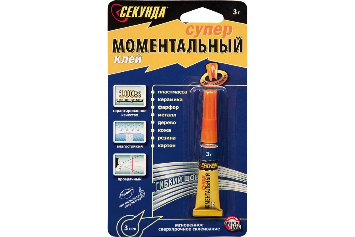 Моментальный клей «Секунда» изготовлен на основе цианакрилата. Используется для соединения изделий и деталей, изготовленных из различных материалов, таких как металл, многослойные пластмассы, винил, резина, керамика, дерево, картон, кожа и кожзаменители, пробковое дерево и ДСП. Формула клеевого состава QuickTime обеспечивает мгновенное склеивание материалов; качество соединения не ухудшается и сохраняет свою прочность в течение длительного времени. Специальная конструкция насадки тюбика уменьшает риск попадания клея на руки и одежду, позволяя удалить защитную мембрану простым поворотом насадки по часовой стрелке.