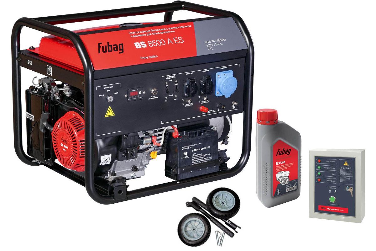 В состав набора входят: Бензиновый генератор FUBAG BS 8500 A ES 8.5 кВа/8 кВт, время работы: 5.5 ч., Комплект колес и ручек для электростанций Fubag (838224), Масло моторное FUBAG Extra 838265 универсальное полусинтетическое 1л SAE 10W40, Блок автомати