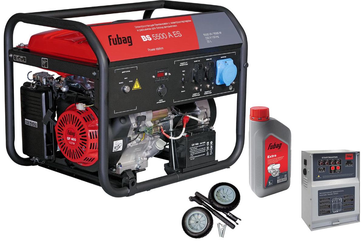 В состав набора входят: Генератор FUBAG BS 5500 A ES (838756) электростанция бензиновая с электростартером и коннектором, Комплект колес и ручек для электростанций Fubag (838224), Масло моторное FUBAG Extra 838265 универсальное полусинтетическое 1л SAE