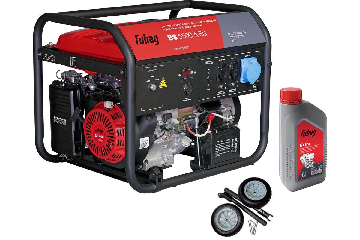 В состав набора входят: Генератор FUBAG BS 5500 A ES (838756) электростанция бензиновая с электростартером и коннектором, Комплект колес и ручек для электростанций Fubag (838224), Масло моторное FUBAG Extra 838265 универсальное полусинтетическое 1л SAE