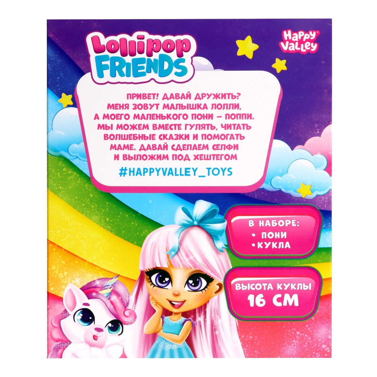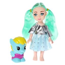 Кукле-малышке с длинными волосами ребёнок сделает причёску. В набор входит весёлый поняшка размером 4 × 4 × 6,5 см. Высота куколки — 15 см.