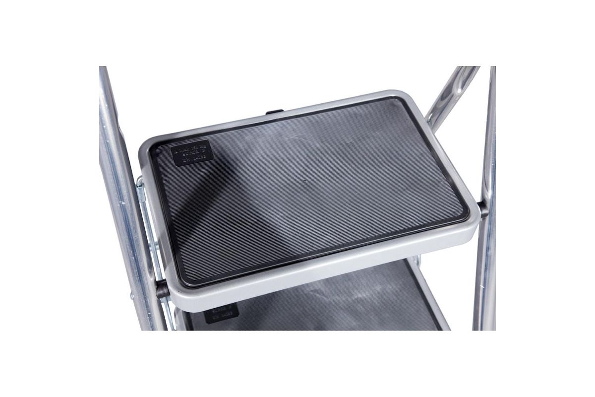 - Алюминиевая подставка с большими ступенями безопасна при подъеме и спуске. Подходит для разнообразных работ внутри помещений.