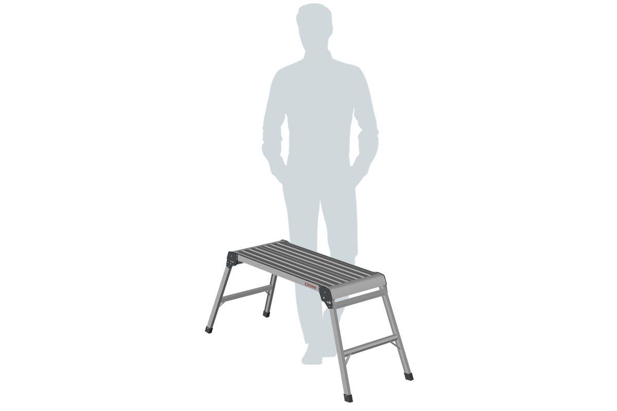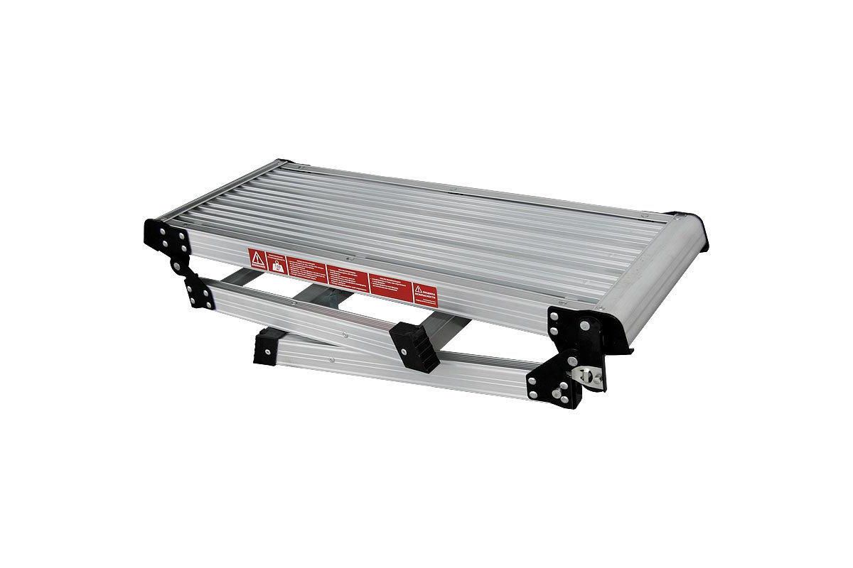 Ступень складная Сорокин 24.48 алюминиевая грузоподъемностью 150 кг - изделие для личных нужд при работе в гараже, с машиной для удобства укладки предметов на высоко расположенные поверхности. Также может использоваться при проведении строительных, малярных и других работ.