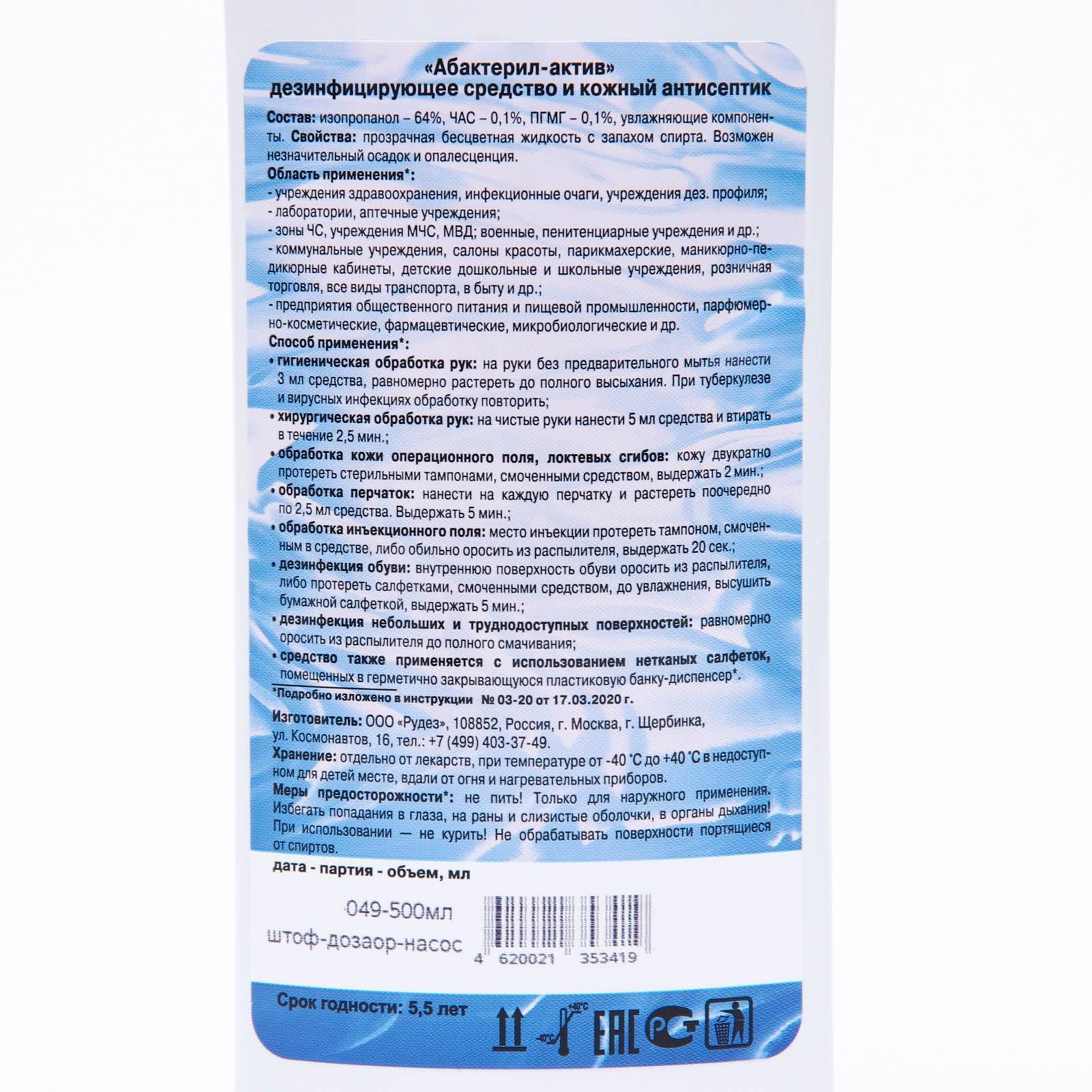 Дезинфицирующее средство Абактерил-АКТИВ, насос-дозатор, 500 мл