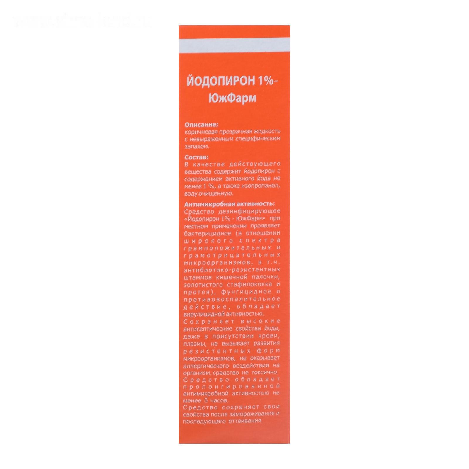 В качестве действующего вещества содержит йодопирон с содержанием активного йода не менее 1 %, а также этанол, воду очищенную.
