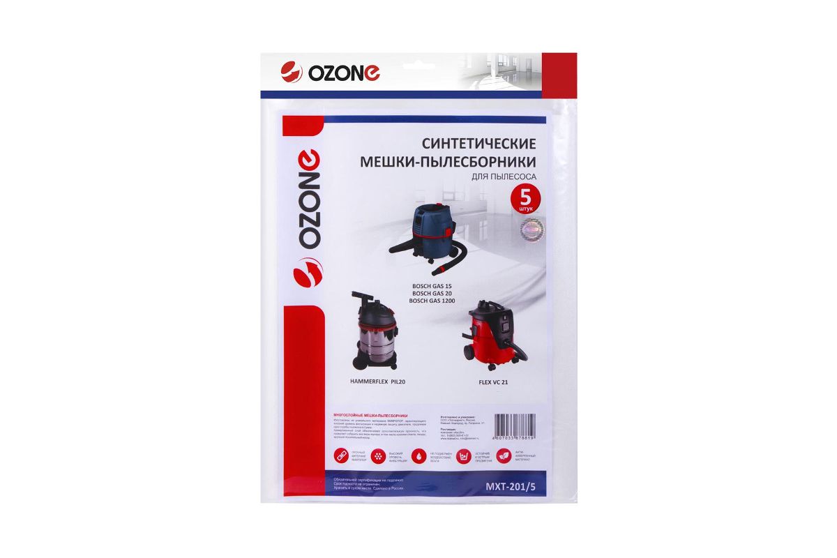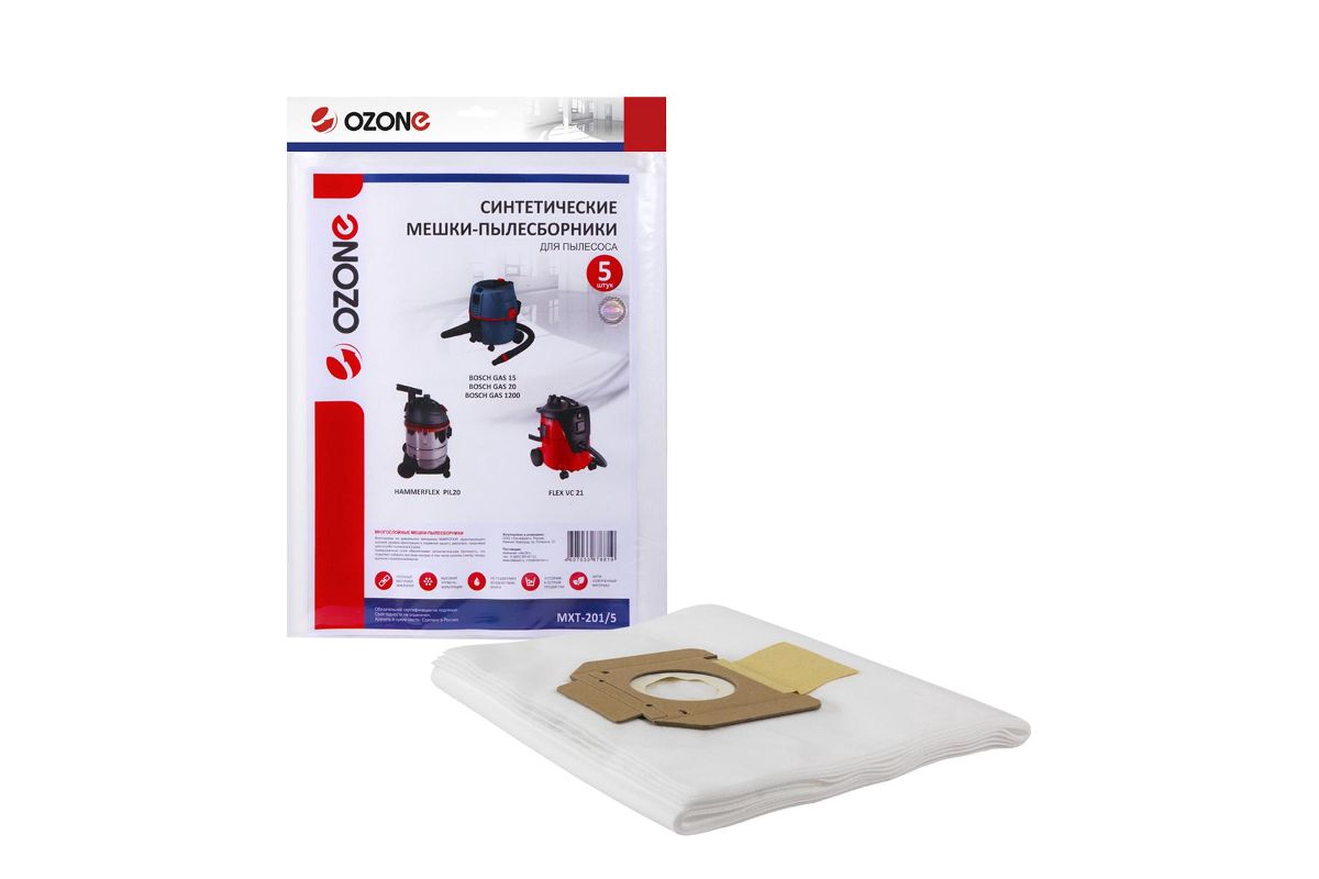 Мешки для пылесоса BOSCH GAS 15, BOSCH GAS 20, FLEX, HAMMER, 5 шт., синтетические, не боятся мокрой пыли, бренд: OZONE, арт. MXT-201/5