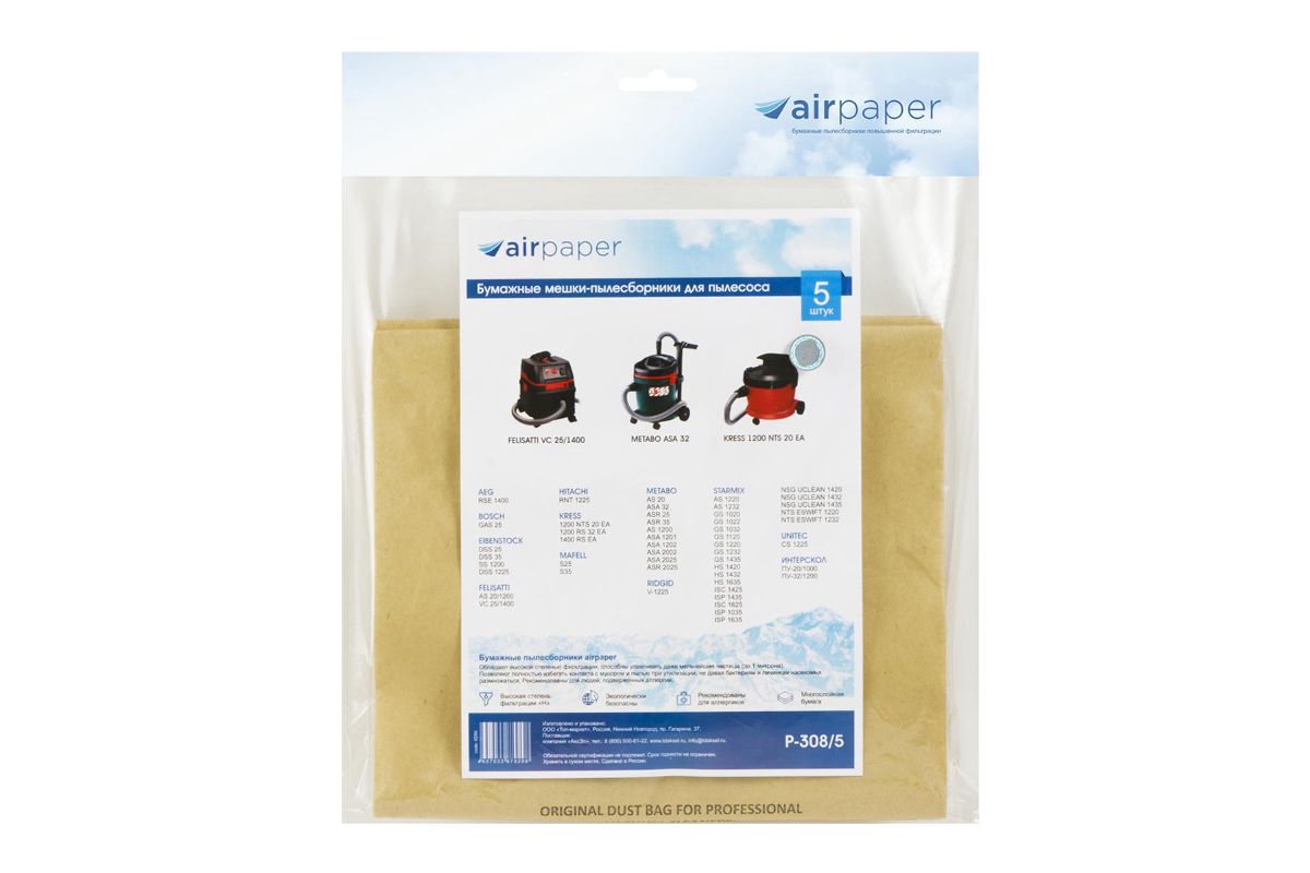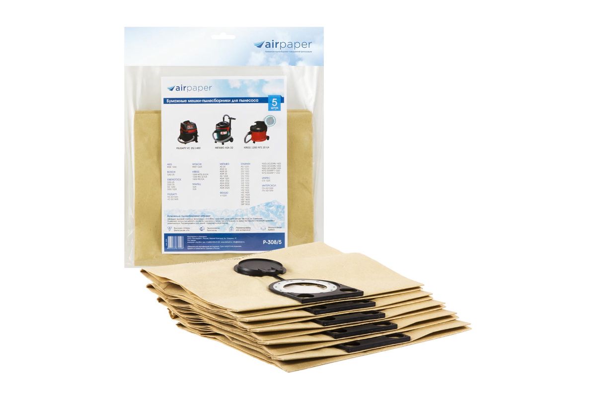 Мешки для пылесоса BOSCH GAS 25, KRESS 1400, ИНТЕРСКОЛ ПУ-32/1200, STARMIX FB20/25/35, AEG, FELISATTI, HITACHI, METABO, 5 шт., бумага, сухая пыль, бренд AIRPAPER, арт. Р-308/5