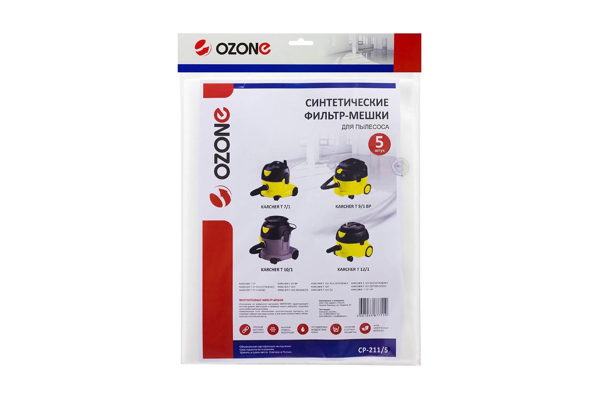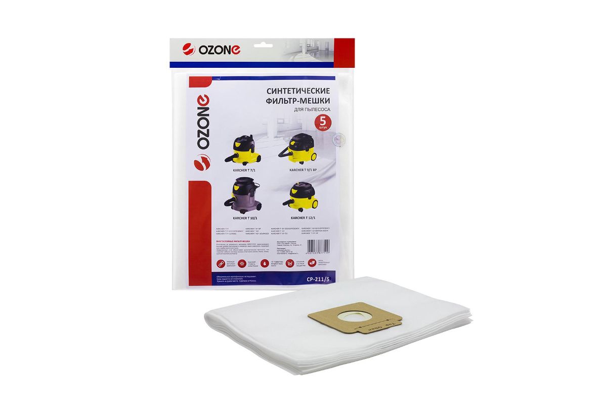 Фильтр-мешки для пылесоса KARCHER T 7/1, T 9/1, T 10/1, T 12/1, 5 шт., синтетика, не боятся мокрой пыли, бренд: OZONE, арт. CP-211/5