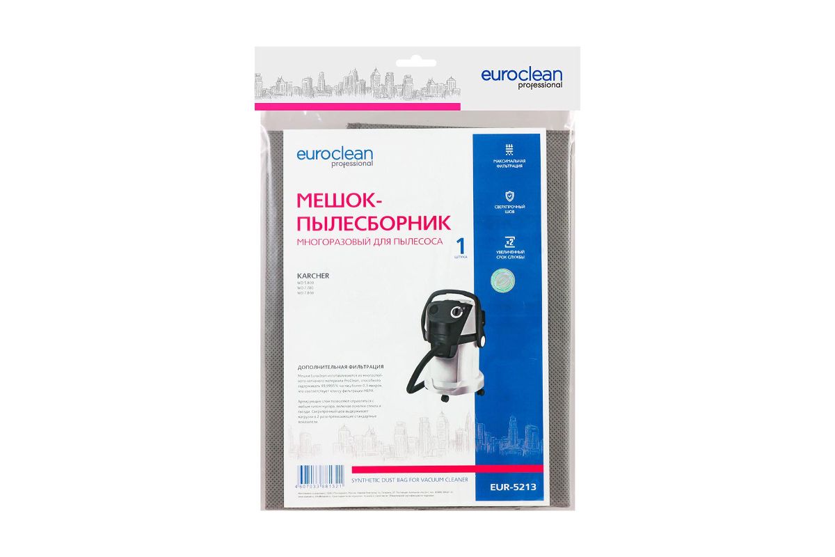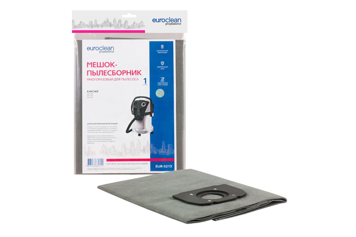 Многоразовый фильтр-мешок с текстильной застежкой для пылесоса KARCHER WD 7.800, 1 шт., синтетический, бренд: EUROCLEAN, арт. EUR-5213