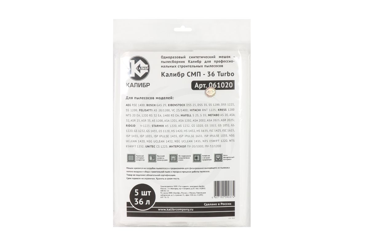 Мешки пылесборники «Калибр СМП-36 Turbo» для профессиональных пылесосов до 36л. 5шт (AEG RSE 1400; BOSCH GAS 25; EIBENSTOCKDSS 25, DSS 35, SS 1200, DSS 1225, SS1200; FELISATTI AS 20/1200, VC 25/1400; HITACHIRNT 1225; KRESS 1200, NTS 20 EA, 1200 RS32 EA, 1400 RS EA; MAFELL S 25, S 35; METABO AS 20, ASA 32, ASR 25, AS 1200, ASA 1201, ASA 1202, ASA 2002, ASA 2025, ASR 2025; RIDGID V-1225; STARMIXAS 1220, AS1232, GS 1020, GS 1022, GS1032, GS 1020, GS 1232, GS 1435, GS 1120, HS 1420, HS 1432, HS 1635, ISC 1425, ISC 1625, ISP 1435, ISP 1035, ISP IPULSE 1435, ISP IPULSE 1635, ISP IPULSE 1035, NSG UCLEAN 1420, NSG UCLEAN 1432, NSG UCLEAN 1435, NTS ESWIFT 1220, NTS ESWIFT 1232; UNITEC CS 1225; ИНТЕРСКОЛ ПУ-20/1000, ПУ-32/1200)