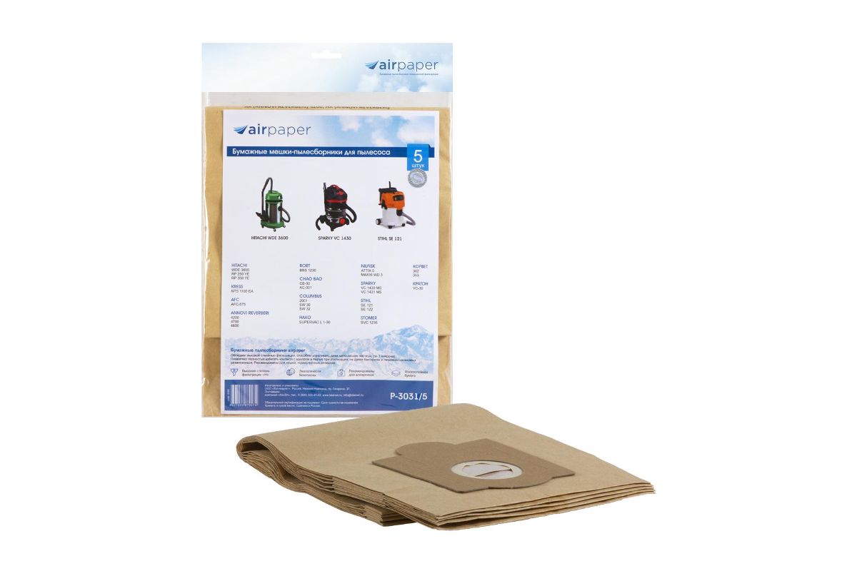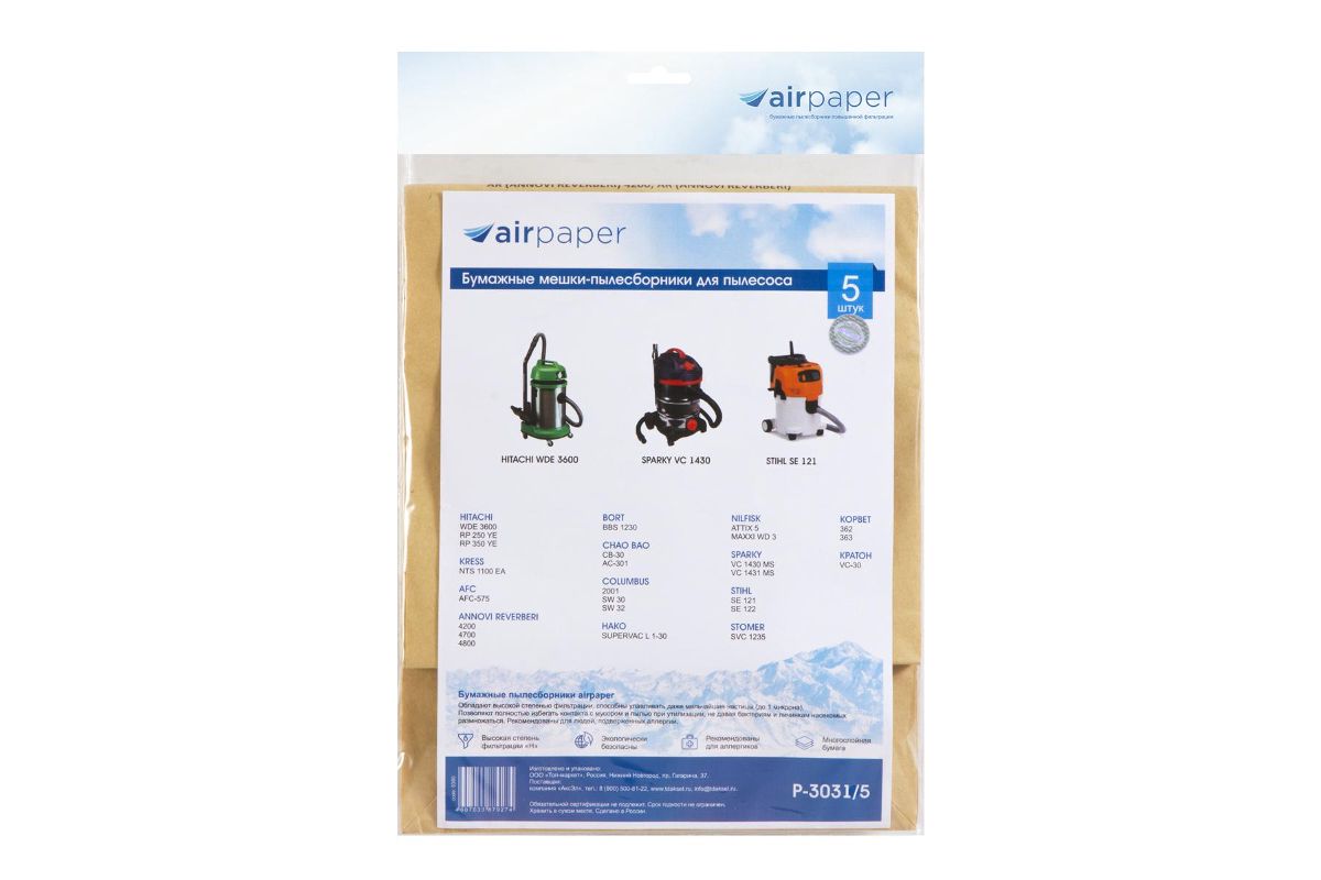 Мешки для пылесоса HITACHI WDE 3600, KRESS NTS 1100 EA, COLUMBUS, NILFISK, SOTECO SPARKY, STIHL, STOMER, КОРВЕТ, КРАТОН, 5 шт., бумага, сухая пыль, бренд: AIRPAPER, арт. Р-3031/5