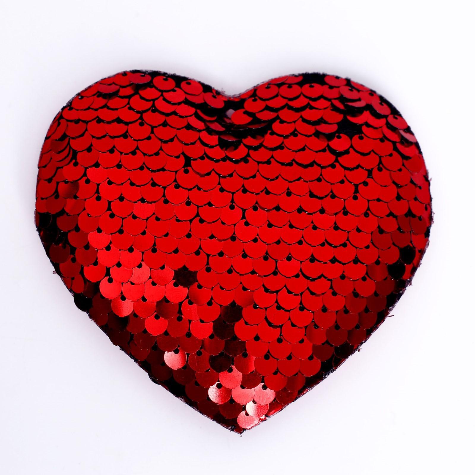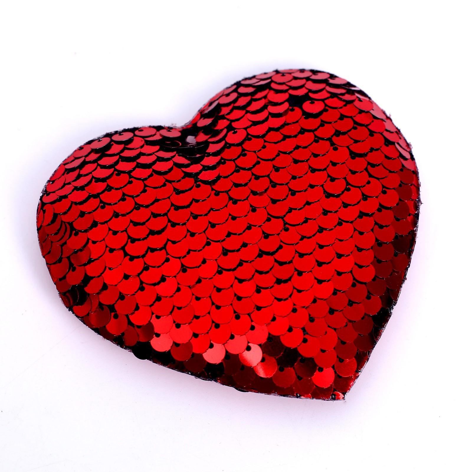 Декоративное сердце набито мягким наполнителем. Лицевая сторона покрыта двухцветными пайетками, благодаря которым цвет сердечка может менять с красного на серебристый.