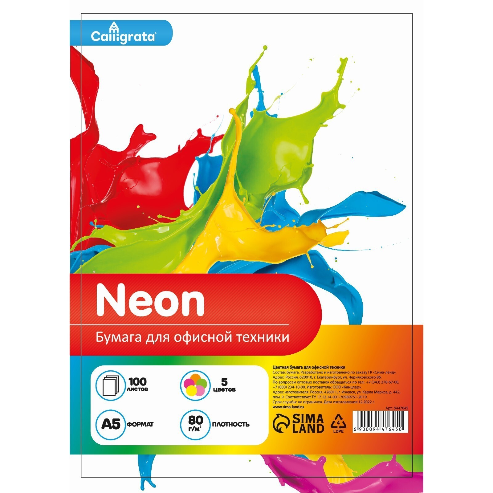 Бумага цветная А5 100л Calligrata НЕОН МИКС 5цв 75г/м2