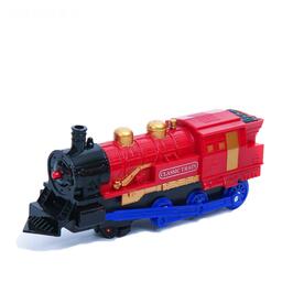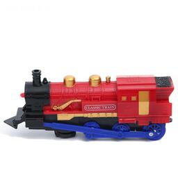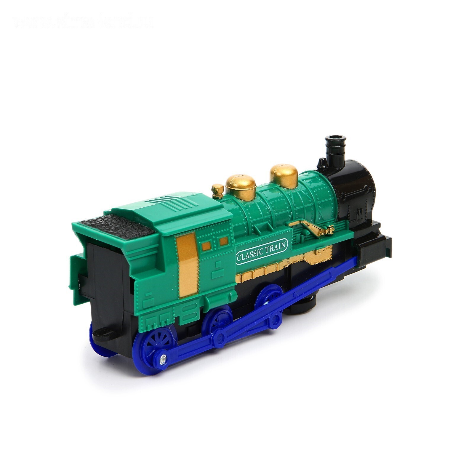 Спереди локомотива светится прожектор. Игрушка имитирует звук работы паровоза, воспроизводит стук по рельсам и предупредительный сигнал.