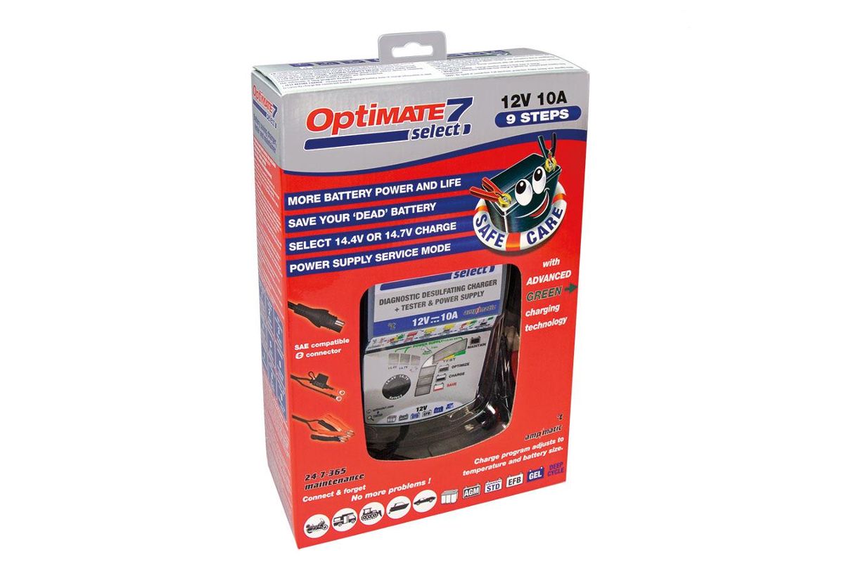 Зарядное устройство Optimate 7 Select, TM250 для всех типов свинцово-кислотных аккумуляторных батарей 12В. Выбор тока режима зарядки 14,3В / 14,7В, режим источника питания для замены аккумулятора без сброса настроек авто. Ampmatic микропроцессор. Восстано