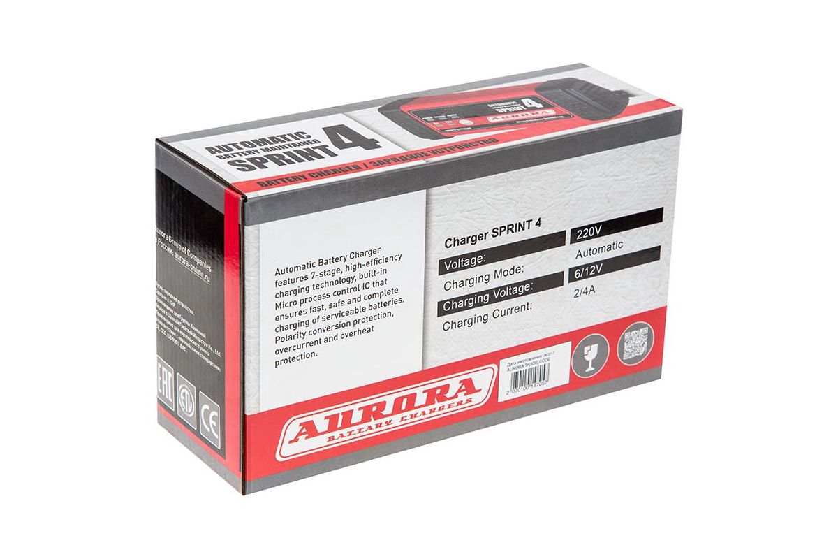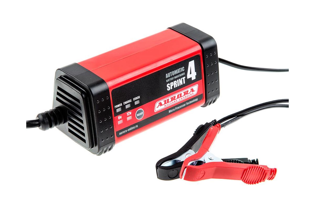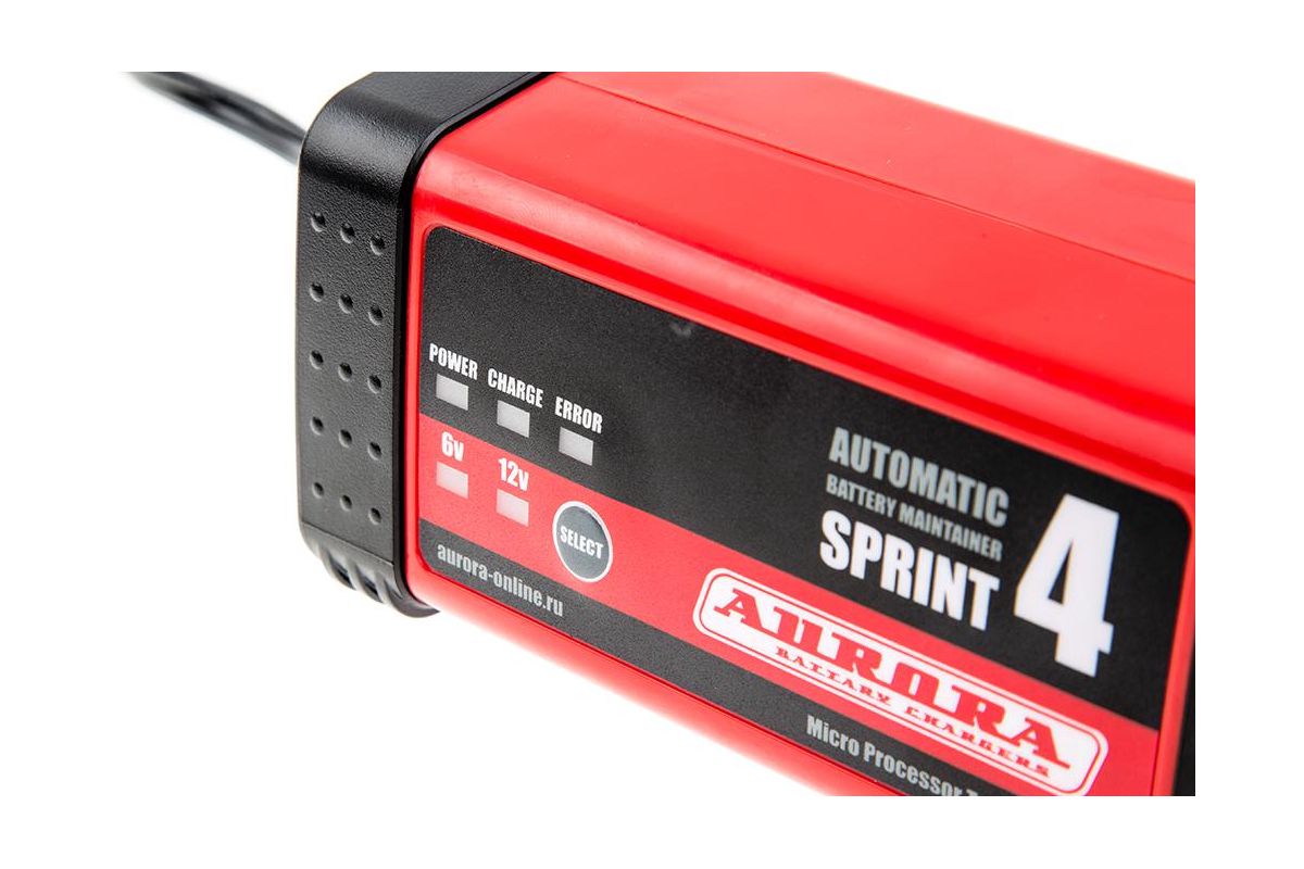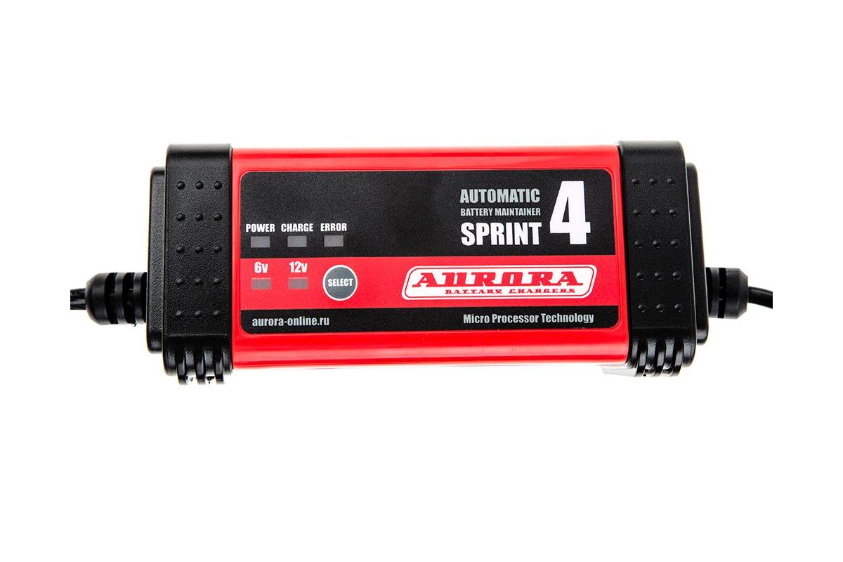 Зарядное устройство AURORA SPRINT 4 automatic работает полностью в автоматическом режиме. С его помощью можно зарядить батарею напряжением 6 или 12 В. Максимальный зарядный ток — 4 А. Процесс зарядки выполняется в 7 этапов. Буферный режим позволяет оставлять устройство включенным после завершения заряда. Благодаря нескольким защитным функциям аккумулятор защищен от перегрева и закипания электролита. Вес модели — 1 кг.