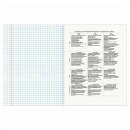 Листы соединены скобами. Линовка блока - клетка, красные поля. Обложка выполнена из мелованного картона плотностью 190 г/м2. В справочном материале для учащихся собраны основные подсказки по школьному предмету.