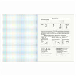 Листы соединены скобами. Линовка блока - клетка, красные поля. Обложка выполнена из мелованного картона плотностью 190 г/м2. В справочном материале для учащихся собраны основные подсказки по школьному предмету.