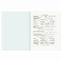 Листы соединены скобами. Линовка блока - клетка, красные поля. Обложка выполнена из мелованного картона плотностью 190 г/м2. В справочном материале для учащихся собраны основные подсказки по школьному предмету.