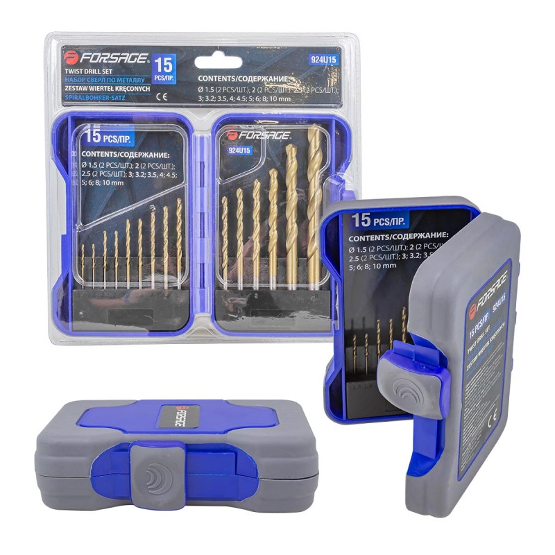 F-924U15 Набор сверл по металлу 15пр(1.5-2шт,2-2шт,2.5-2шт,3,3.2,3.5,4,4.5,5,6,8,10мм)в кейсе