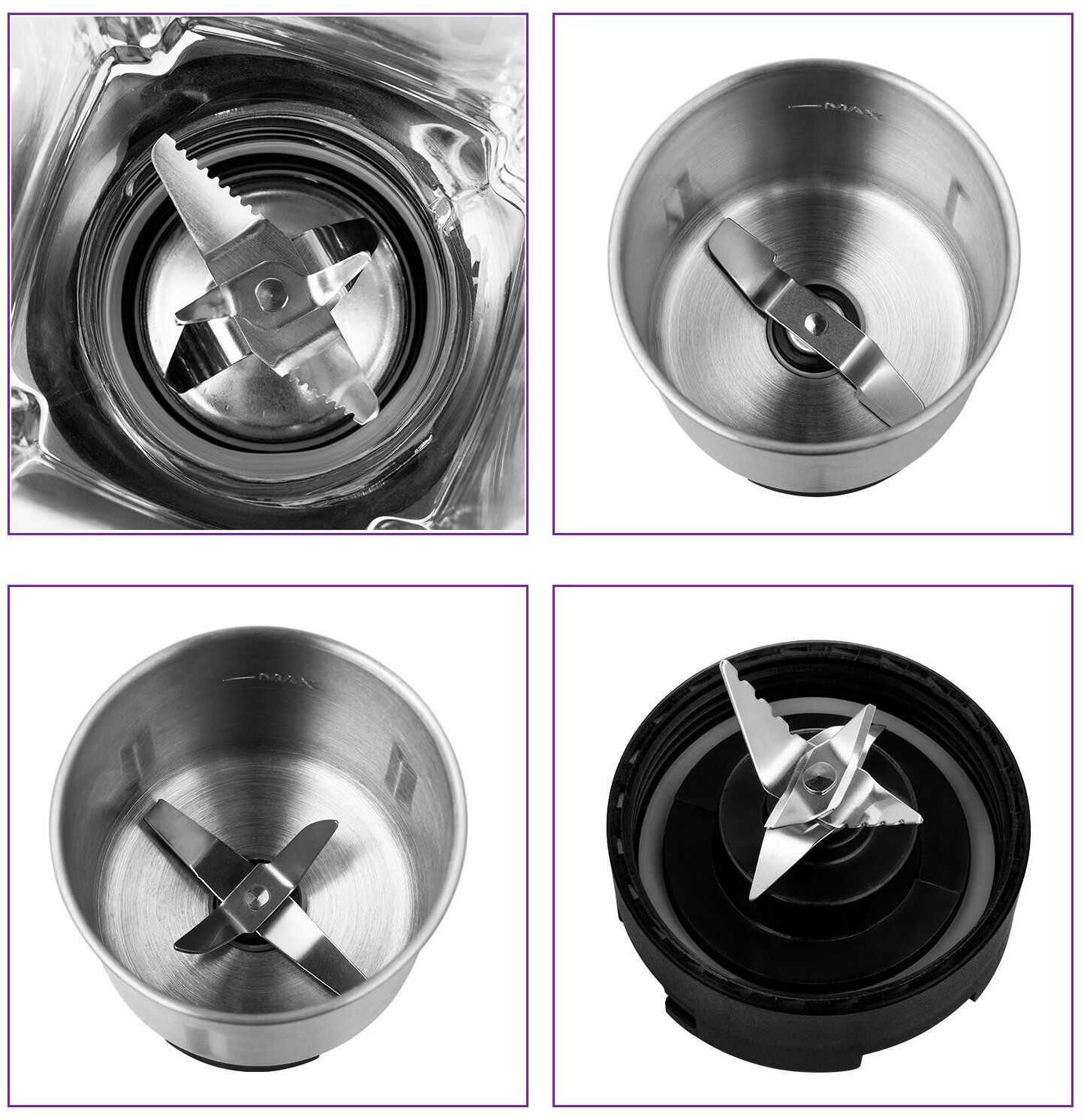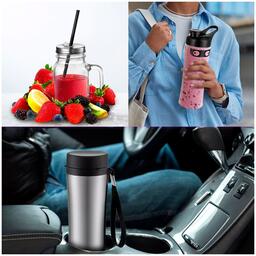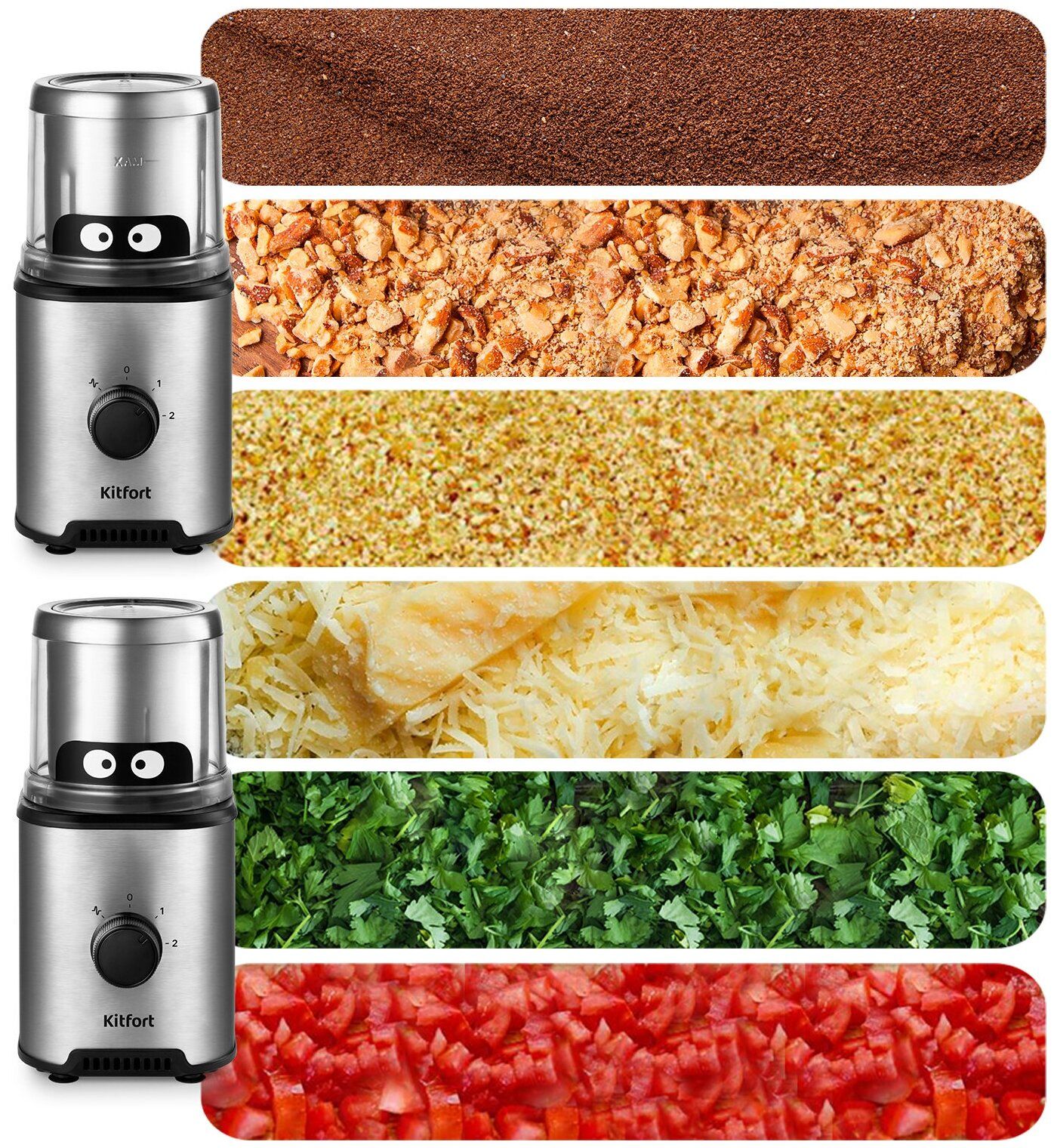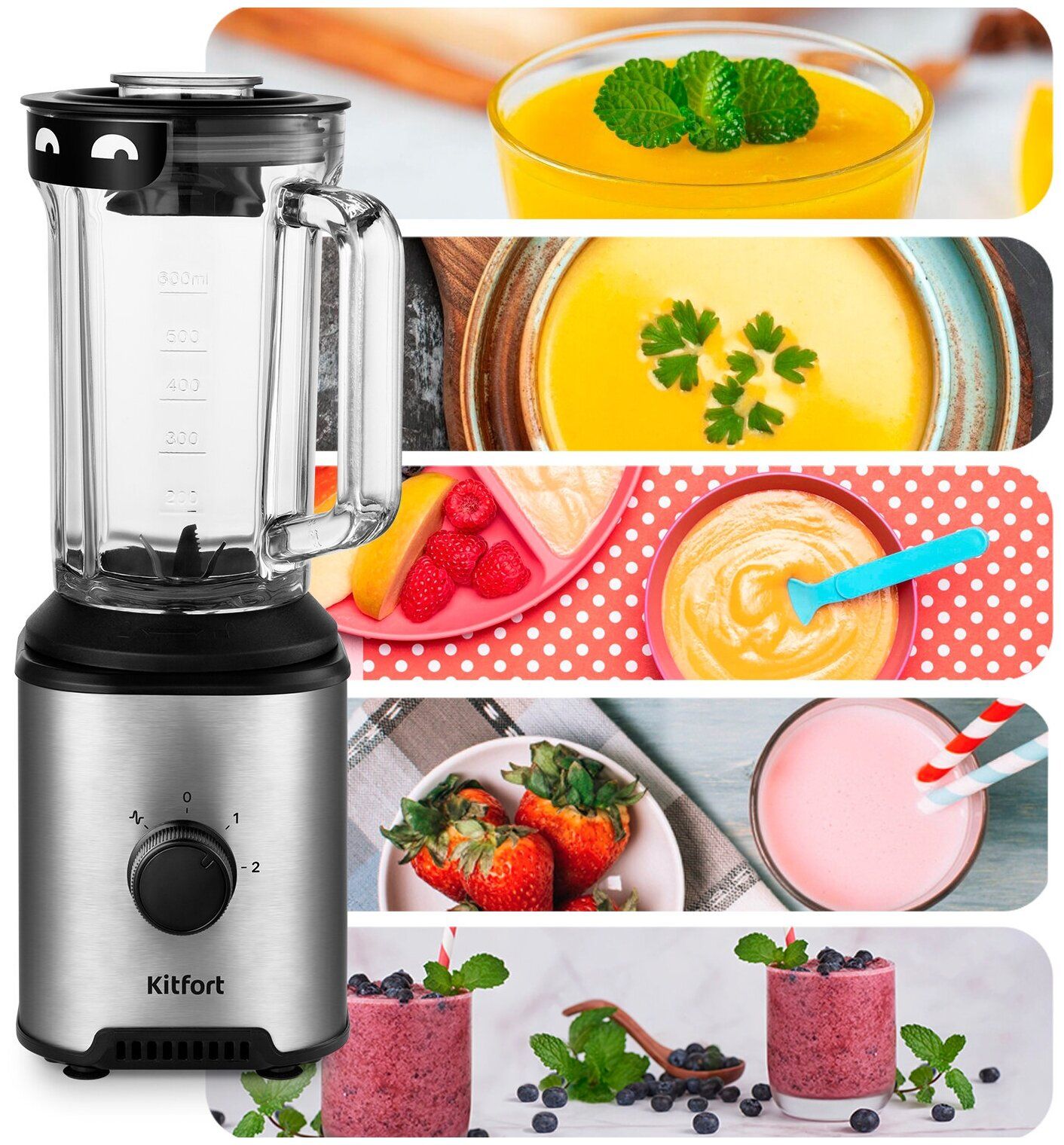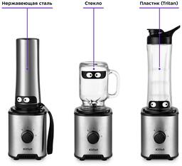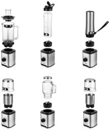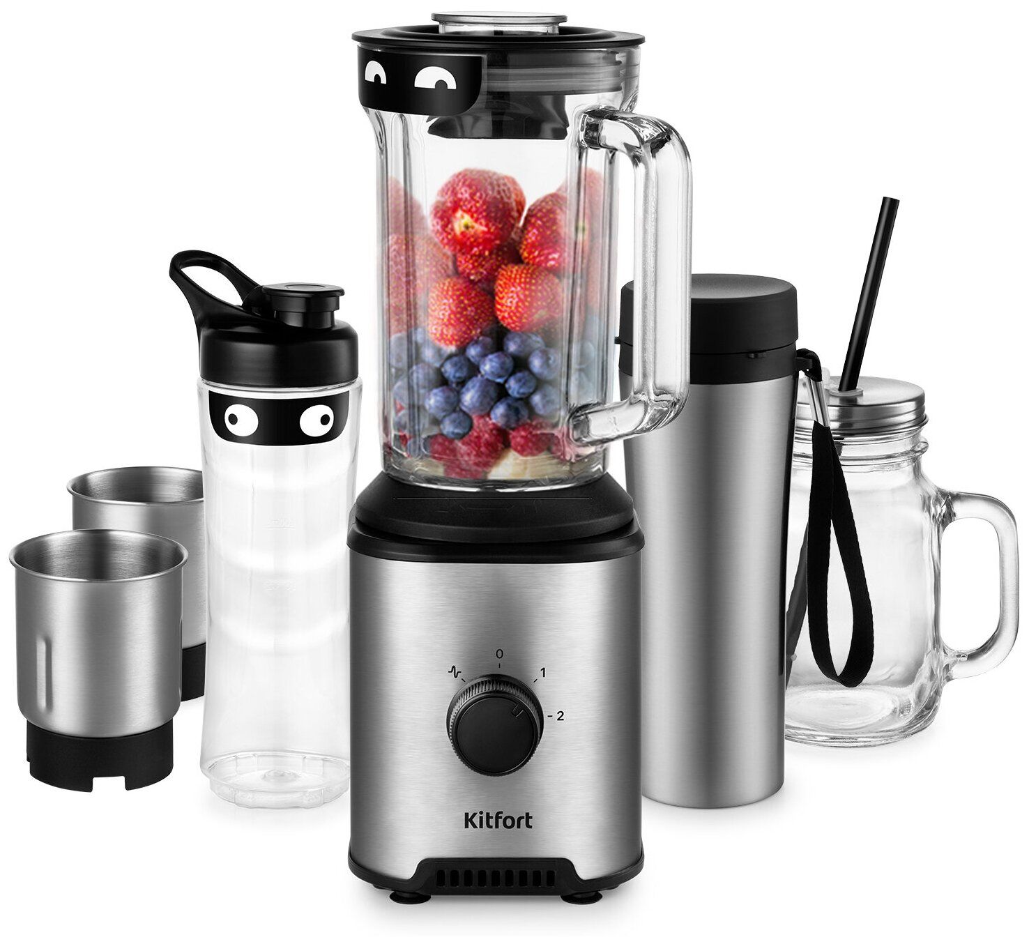 Блендер Kitfort КТ-3078 сочетает в себе функции 6 самостоятельных устройств: стационарный блендер, блендер Shake & Take, блендер с металлической и стеклянной кружками, измельчитель и кофемолка. У стационарного блендера стеклянная чаша ёмкостью 600 мл. В крышке есть отверстие, закрываемое колпачком, для добавления ингредиентов во время работы. Он колет лёд, готовит смузи, протеиновые смеси, молочные коктейли, супы-пюре, соусы и детское питание. Стеклянная кружка, портативная пластиковая бутылка и металлическая кружка имеют объём 600 мл. Они позволяют готовить напитки сразу в ёмкости, из которой можно пить готовый напиток и брать его с собой на работу, на прогулку или тренировку. На стеклянную кружку накручивается крышка с трубочкой, которые идут в комплекте. Пластиковая бутылка Shake & Take имеет крышку с ручкой и отверстием для питья. Металлическая кружкка комплектуется герметичной крышкой, и её можно использовать как термос. Кофемолка справится с кофейными зёрнами, специями и орехами. Измельчитель позволит быстро измельчить небольшое количество овощей, шпината, сыра. Чаши выполнены из нержавеющей стали. Для безопасной и чистой работы чаши накрываются пластиковой крышкой. Блендер, кофемолка, измельчитель, портативные чаши оснащены 4-лезвийными и 2-лезвийными блоками ножей. Лезвия выполнены из нержавеющей стали и отличаются своей силой, благодаря чему рубят продукты на высокой скорости вращения до 27500 оборотов в минуту. Регулятор скорости позволяет включить и выключить блендер, включить импульсный режим или выбрать подходящую скорость работы. Всего у блендера 2 скорости и импульсный режим. В импульсном режиме блендер работает, пока вы держите регулятор скорости. Все детали блендера легко разбираются, что позволяет тщательно промывать детали. Для обеспечения безопасности блендер может работать только с установленной чашей, а измельчитель и кофемолка не включится без установленной крышки.