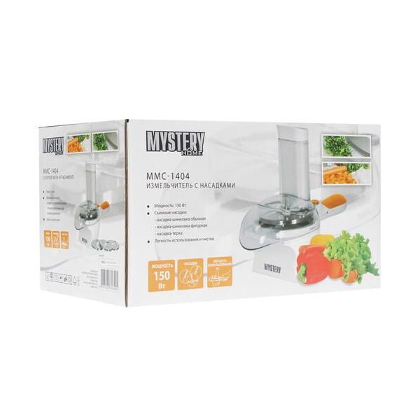 Блендер Mystery MMC-1404 - компактный прибор, в полезности которого можно не сомневаться. Этой помощнице найдется место на любой кухне, ведь с ее помощью вы сможете измельчить сыр, шоколад или сушеные фрукты. Необходимая обработка ингредиентов пройдет достаточно быстро за счет оптимальной мощности, достигающей 150 Вт. Не разочарует и дизайн представленной модели, в котором сочетается элегантность и простота. Классическую белую расцветку корпуса гармонично дополняют яркие оранжевые вставки. Блендер Mystery MMC-1404 укомплектован фигурной насадкой шинковкой, благодаря которой вы сможете сделать украшения для торта или просто необычно нашинковать овощи. За пластиковым корпусом легко ухаживать: для удаления с него загрязнений достаточно вооружиться влажной тряпочкой и потратить на эту процедуру минимум времени и усилий. Острые металлические лезвия играючи справляются с измельчением, шинковкой и нарезкой даже твердых продуктов. Габариты представленной модели свидетельствуют о ее компактности - 17.5x28.5x16 см.